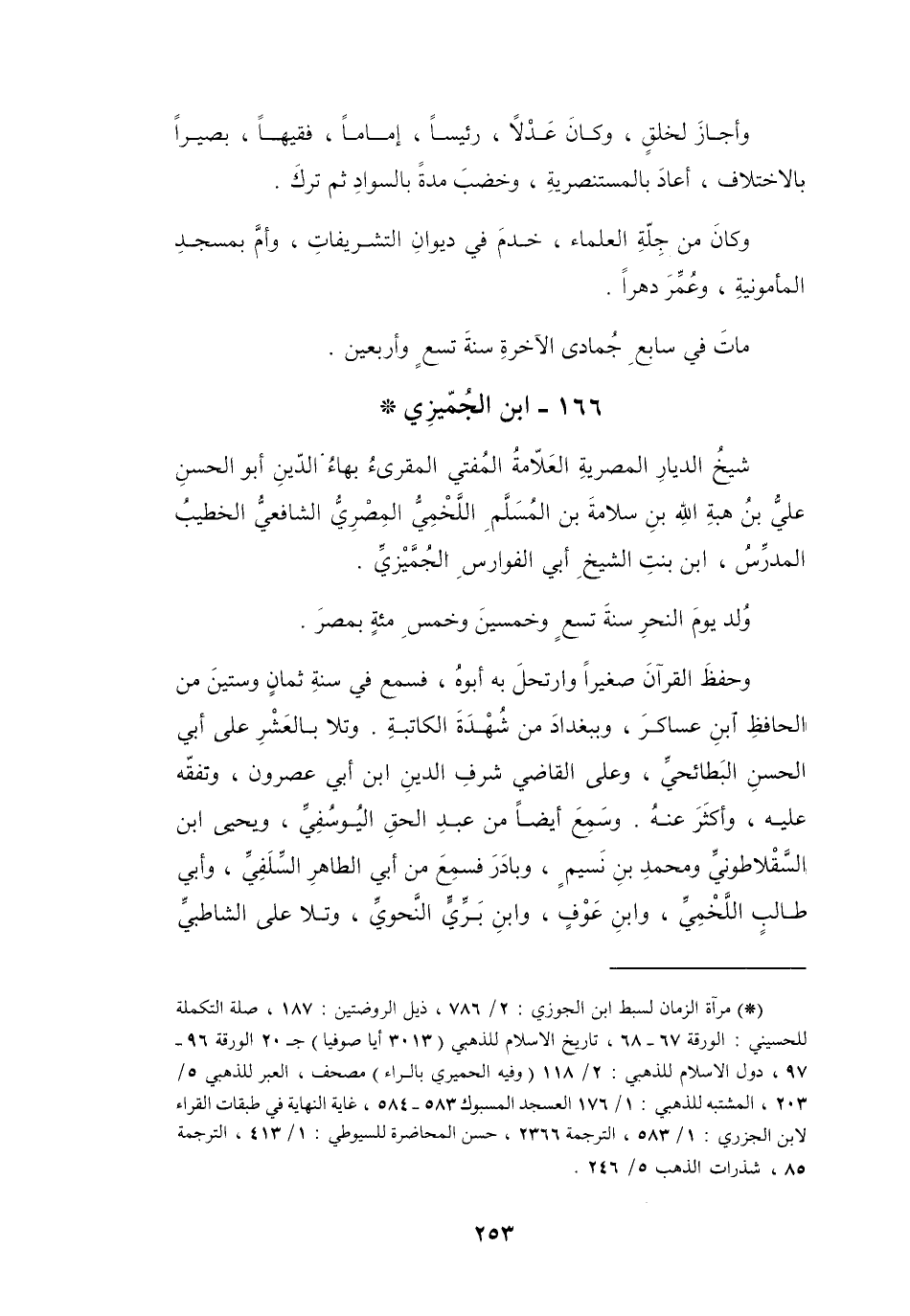 166 - ابْنُ الجُمَّيْزِيِّ عَلِيُّ بنُ هِبَةِ اللهِ بنِ سَلاَمَةَ اللَّخْمِيُّ *