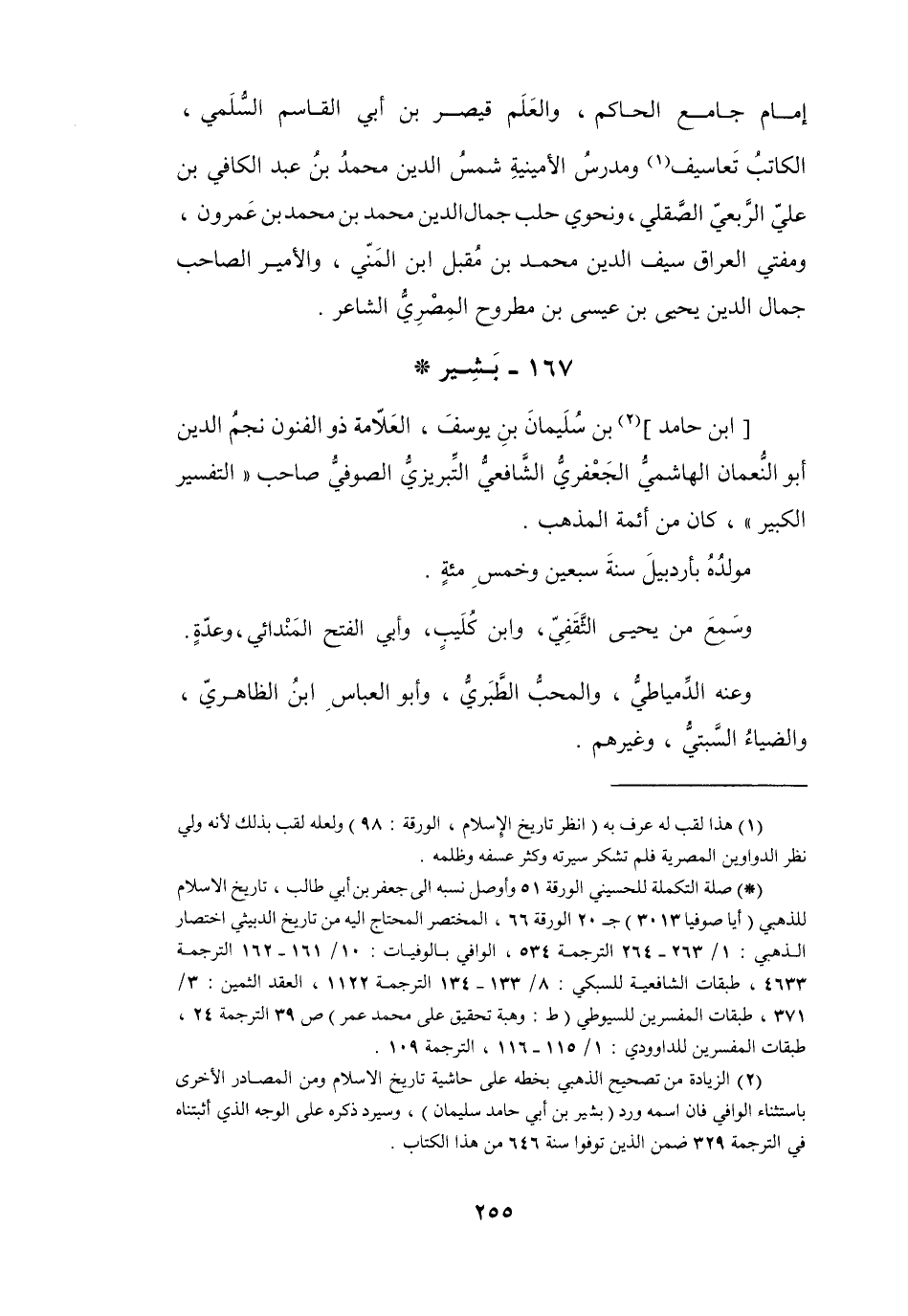 (2) الزيادة من تصحيح الذهبي بخطه على حاشية تاريخ الإسلام ومن المصادر الأخرى باستثناء الوافي فان اسمه ورد (بشير بن أبي حامد سليمان) ، وسيرد ذكره على الوجه الذي أثبتناه في الترجمة 329 ضمن الذين توفوا سنة 646 من هذا الكتاب.