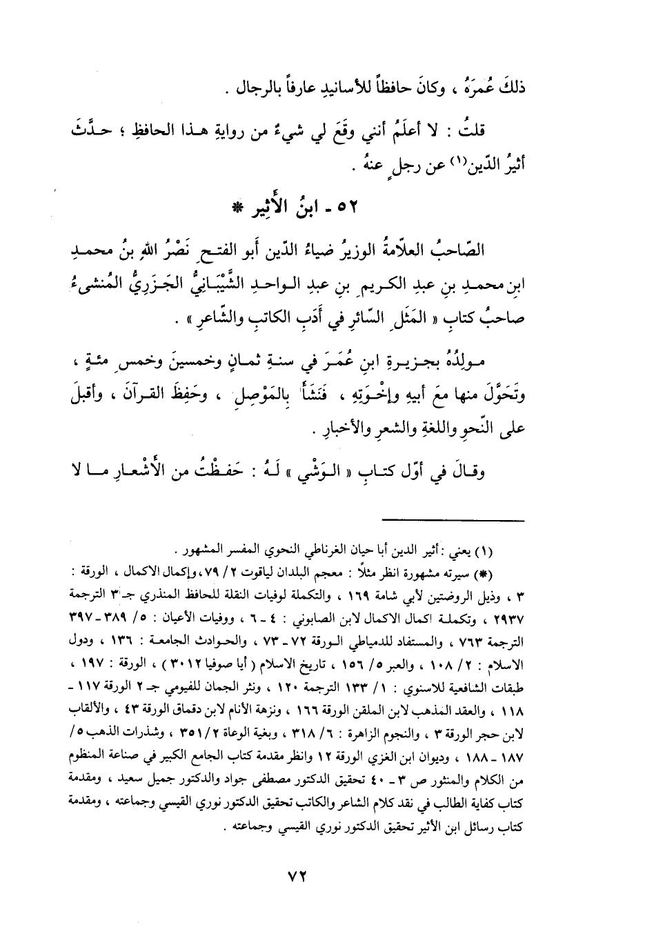 (*) سيرته مشهورة انظر مثلا: معجم البلدان لياقوت 2 / 79، وإكمال الإكمال، الورقة: 3، وذيل الروضتين لأبي شامة 169، والتكملة لوفيات النقلة للحافظ المنذري ج 3 الترجمة 2937، وتكملة اكمال الإكمال لابن الصابوني: 4 - 6، ووفيات الأعيان: 5 / 389 - 397 الترجمة 763، والمستفاد للدمياطي الورقة 72 - 73، والحوادث الجامعة: 136، ودول الإسلام: 2 / 108، والعبر 5 / 156، تاريخ الإسلام (أيا صوفيا 3012) ، الورقة: 197، طبقات الشافعية للاسنوي: 1 / 133 الترجمة 120، ونثر الجمان للفيومي ج 2 الورقة 117 118، والعقد المذهب لابن الملقن الورقة 166، ونزهة الانام لابن دقماق الورقة 43، والألقاب لابن حجر الورقة 3، والنجوم الزاهرة: 6 / 318، وبغية الوعاة 2 / 351، وشذرات الذهب 5 / 187 - 188، وديوان ابن الغزي الورقة 12 وانظر مقدمة كتاب الجامع الكبير في صناعة المنظوم من الكلام والمنثور ص 3 - 40 تحقيق الدكتور مصطفى جواد والدكتور جميل سعيد، ومقدمة كتاب كفاية الطالب في نقد كلام الشاعر والكاتب تحقيق الدكتور نوري القيسي وجماعته، ومقدمة كتاب رسائل ابن الأثير تحقيق الدكتور نوري القيسي وجماعته.