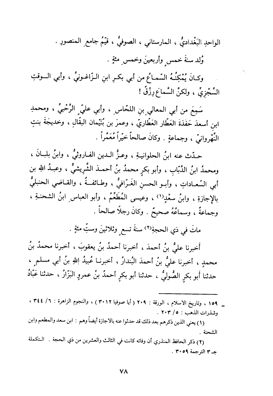 = 159، وتاريخ الإسلام، الورقة: 209 (أيا صوفيا 3012) ، والنجوم الزاهرة: 6 / 344، وشذرات الذهب: 5 / 203.
