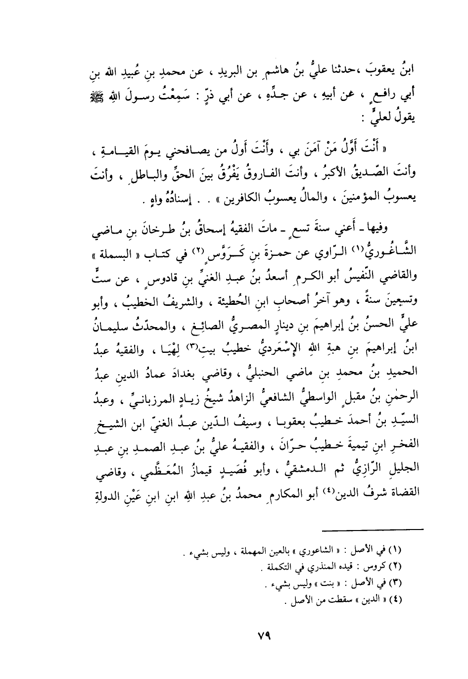 سَمِعْتُ رَسُوْلَ اللهِ -صَلَّى اللَّهُ عَلَيْهِ وَسَلَّمَ- يَقُوْلُ لِعَلِيٍّ: (أَنْتَ أَوَّلُ مَنْ آمَنَ بِي، وَأَنْتَ أَوَّلُ مَنْ يُصَافِحُنِي يَوْمَ القِيَامَةِ، وَأَنْتَ الصِّدِّيْقُ الأَكْبَرُ، وَأَنْتَ الفَارُوْقُ يَفْرُقُ بَيْنَ الحَقِّ وَالبَاطِلِ، وَأَنْتَ يَعسُوبُ المُؤْمِنِيْنَ، وَالمَالُ يَعْسُوبُ الكَافِرِيْنَ -) ، إِسْنَادُهُ وَاهٍ.