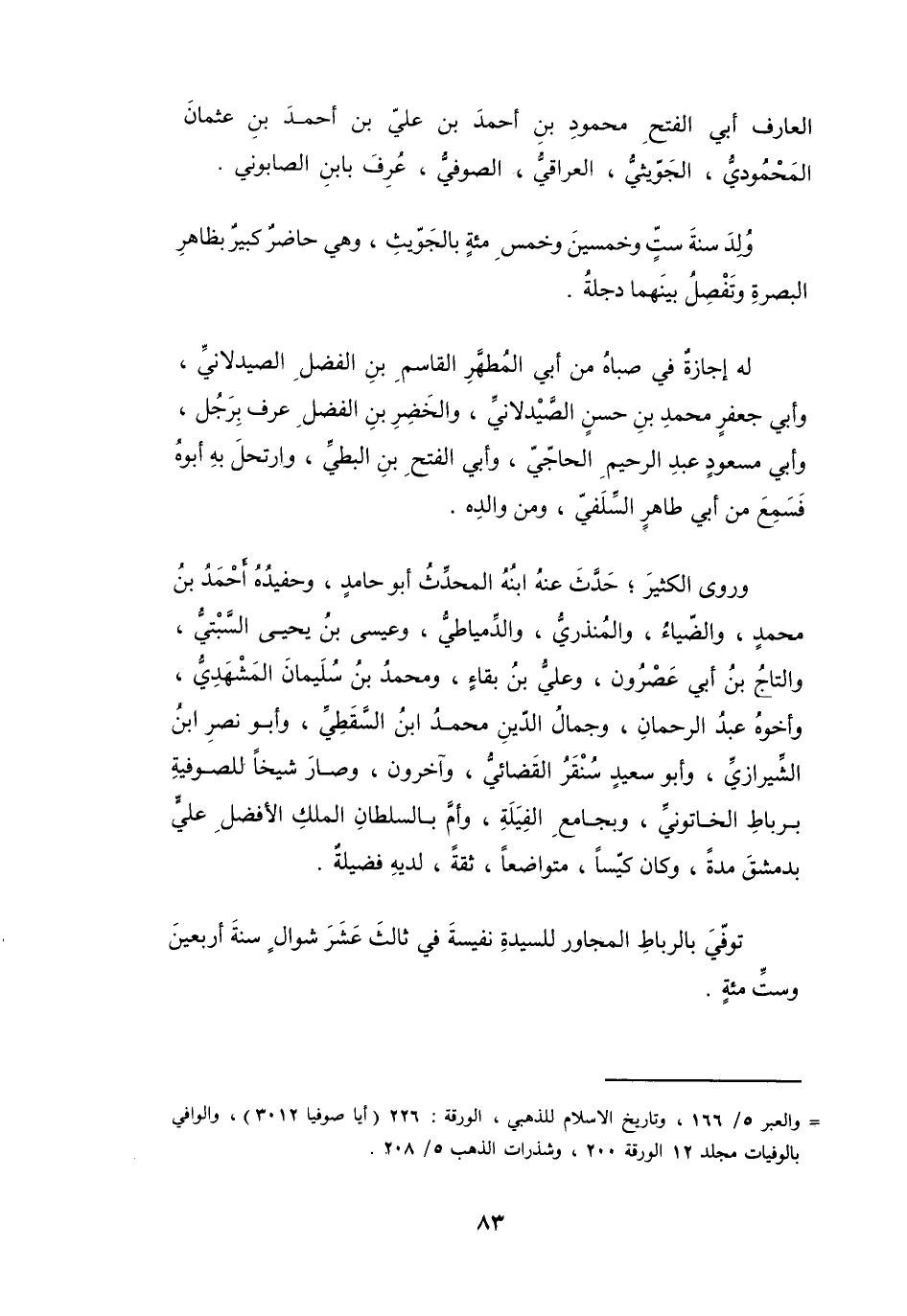 العَارِفِ أَبِي الفَتْحِ مَحْمُوْدِ بنِ أَحْمَدَ بنِ عَلِيِّ بنِ أَحْمَدَ بنِ عُثْمَانَ المَحْمُوْدِيُّ، الجَوِّيْثيُّ، العِرَاقِيُّ، الصُّوْفِيُّ، عُرِفَ بِابْنِ الصَّابُوْنِيّ.