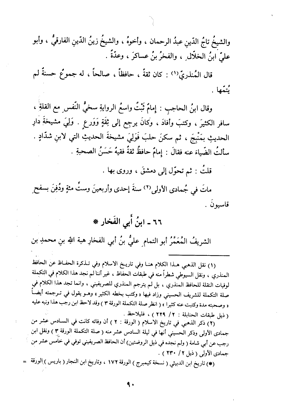(1) نقل الذهبي هذا الكلام هنا وفي تاريخ الإسلام وفي تذكرة الحفاظ عن الحافظ المنذري، ونقل السيوطي شطرا منه في طبقات الحفاظ، غير أننا لم نجد هذا الكلام في التكملة لوفيات النقلة للحافظ المنذري، بل لم يترجم المنذري للصريفيني، وانما تجد هذا الكلام في صلة التكملة للشريف الحسيني وزاد فيها " وكتب بخطه الكثير " وهو يقول في ترجمته أيضا " وصحبته مدة وكتبت عنه كثيرا " (انظر صلة التكملة الورقة 3) وقد لاحظ ابن رجب هذا ونبه عليه (ذيل طبقات الحنابلة: 2 / 229) ، فليلاحظ.