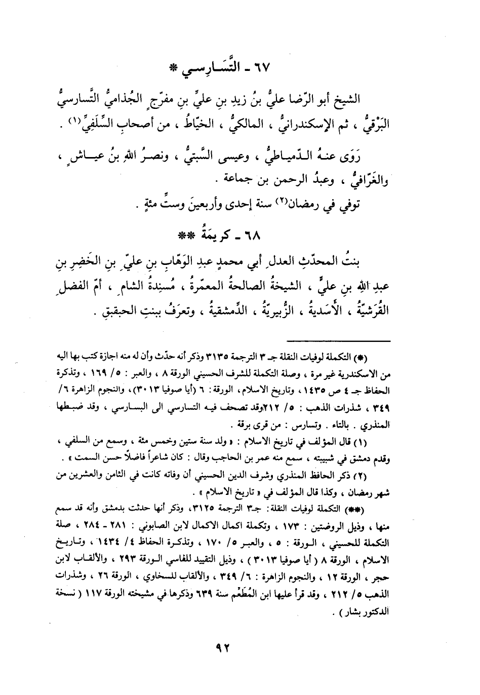 (*) التكملة لوفيات النقلة ج 3 الترجمة 3135 وذكر أنه حدث وأن له منه اجازة كتب بها إليه من الإسكندرية غير مرة، وصلة التكملة للشرف الحسيني الورقة 8، والعبر: 5 / 169، وتذكرة الحفاظ ج 4 ص 1435، وتاريخ الإسلام، الورقة: 6 (أيا صوفيا 3013) ، والنجوم الزاهرة 6 / 349، شذرات الذهب: 5 / 212، وقد تصحف فيه التسارسي إلى البسارسي، وقد ضبطها المنذري بالتاء.