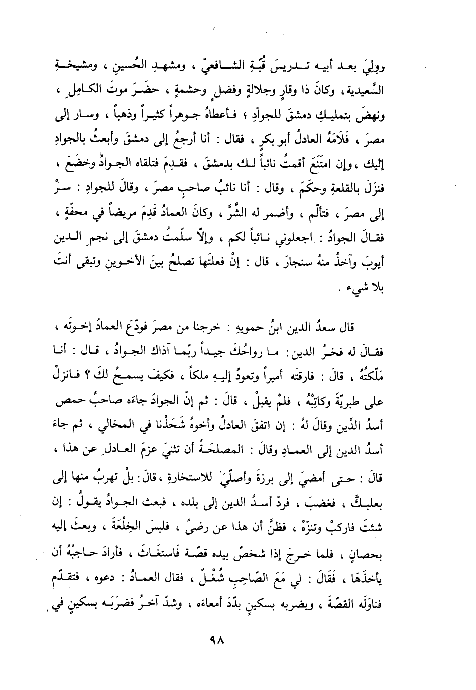 قَالَ سَعْدُ الدِّيْنِ ابْن حَمُّوَيْه: خَرَجْنَا مِنْ مِصْرَ، فَودَّعَ العِمَادُ إِخْوَتَهُ، فَقَالَ لَهُ فَخْر الدِّيْنِ: مَا روَاحُكَ جَيِّداً، رُبَّمَا آذَاكَ الجَوَادُ.
