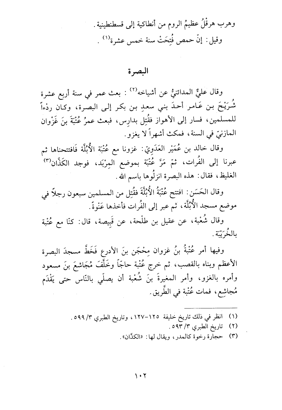 وقال خالد بن عمير العدوي: غزونا مع عتبة الأبلة فافتتحناها ثم عبرنا إلى الفرات، ثم مر عتبة بموضع المربد، فوجد الكذان الغليظ، فقال: هذه البصرة انزلوها باسم الله.