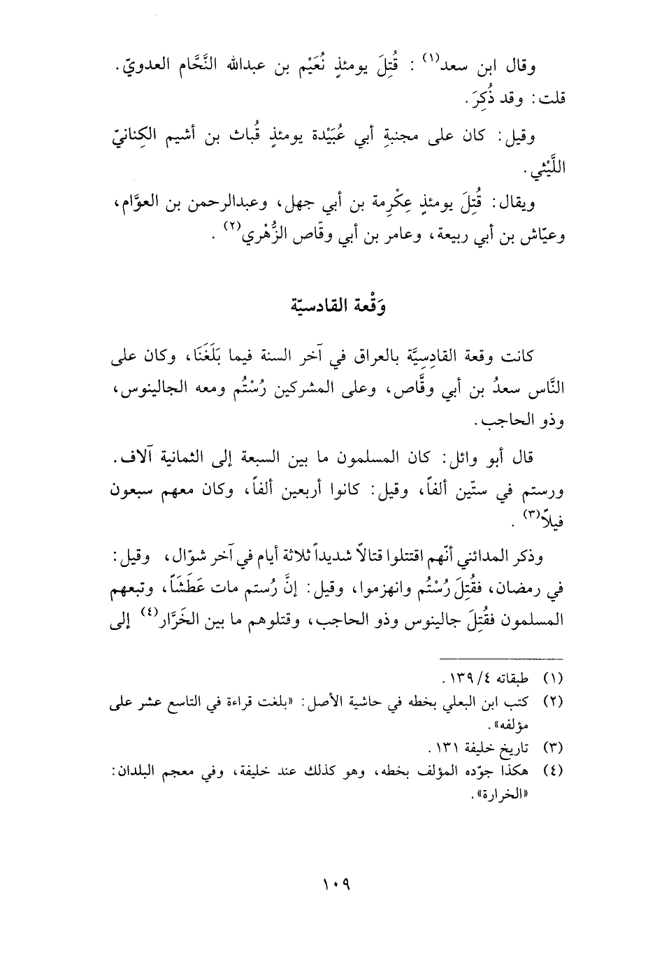 وقال ابن سعد: قتل يومئذ نعيم بن عبد الله النحام العدوي قلت: وقد ذكر.