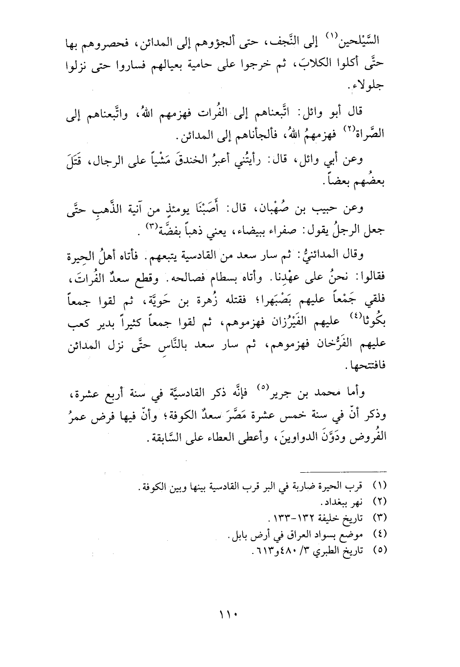 السيلحين إلى النجف، حتى ألجؤوهم إلى المدائن، فحصروهم بها حتى أكلو الكلاب، ثم خرجوا على حامية بعيال فساروا حتى نزلوا جلولاء.