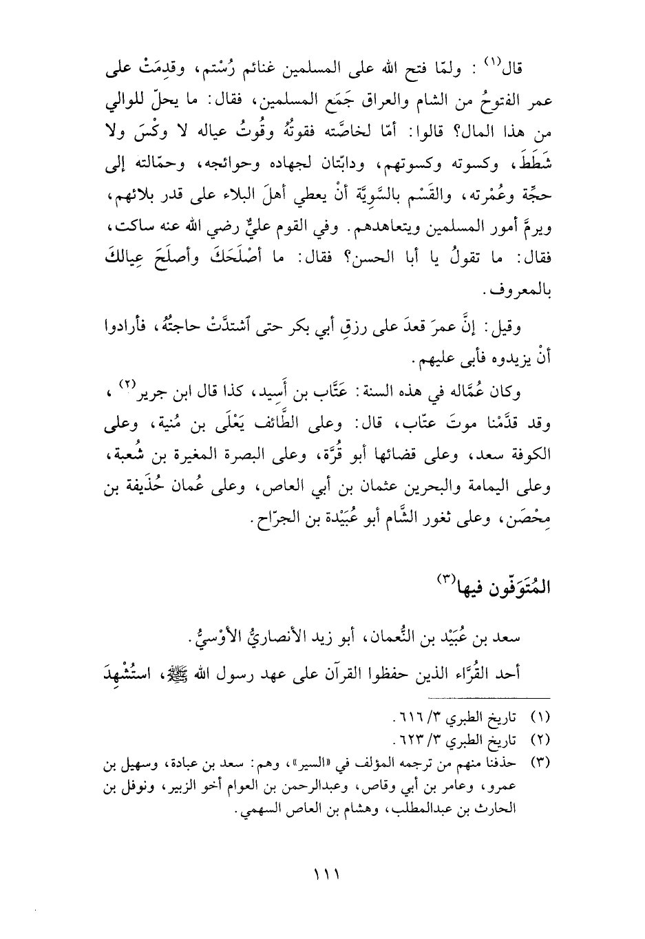 قال: وعلى الطائف يعلى بن منية، وعلى الكوفة سعد، وعلى قضائها أبو قرة، وعلى البصرة المغيرة بن شعبة، وعلى اليمامة والبحرين عثمان بن أبي العاص، وعلى عمان حذيفة بن محصن، وعلى ثغور الشام أبو عبيدة بن الجراح.