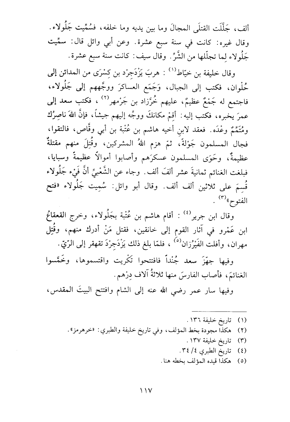 وقال خليفة بن خياط: هرب يزدجرد بن كسرى من المدائن إلى حلوان، فكتب إلى الجبال، وجمع العساكر ووجههم إلى جلولاء، فاجتمع له جمع عظيم، عليهم خرزاد بن جرمهر، فكتب سعد إلى عمر يخبره، فكتب إليه: أقم مكانك ووجه إليهم جيشا، فإن الله ناصرك ومتمم وعده، فعقد لابن أخيه هاشم بن عتبة بن أبي وقاص فالتقوا، فجال المسلمون جولة، ثم هزم الله المشركين، وقتل منهم مقتلة عظيمة، وحوى المسلمون عسكرهم وأصابوا أموالا عظيمة وسبايا، فبلغت الغنائم ثمانية عشر ألف ألف. وجاء عن الشعبي أن فيء جلولاء قسم على ثلاثين ألف ألف. وقال أبو وائل: سميت جلولاء "فتح الفتوح".