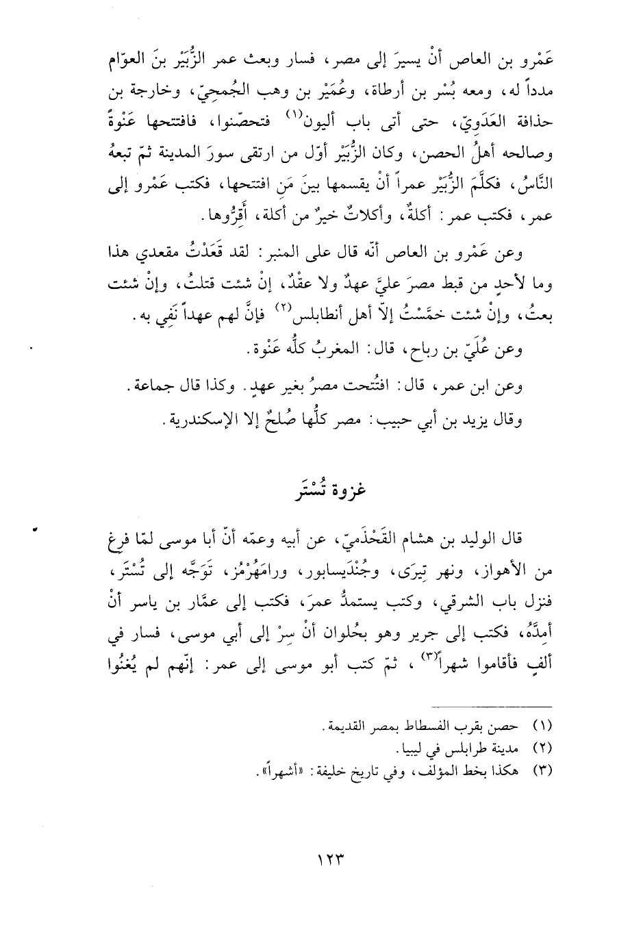 وعن ابن عمر قال: افتتحت مصر بغير عهد وكذا قال جماعة.