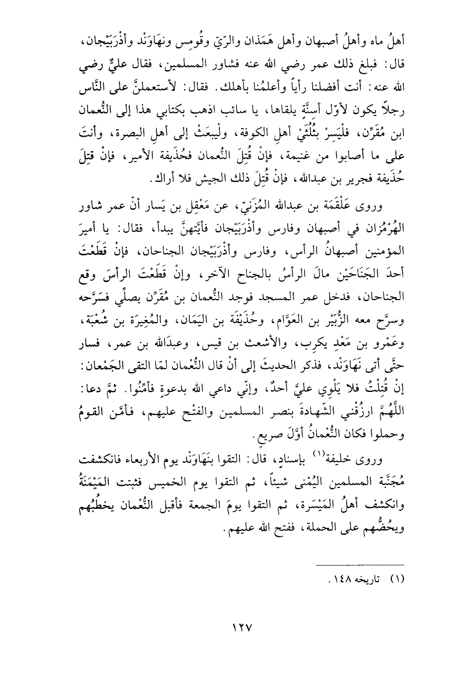 أهل ماه وأهل أصبهان وأهل همذان والري وقومس ونهاوند وأذربيجان، قال: فبلغ ذلك عمر -رضي الله عنه- فشاور المسلمين، فقال علي -رضي الله عنه-: أنت أفضلنا رأيا وأعلمنا بأهلك. فقال: لأستعملن على الناس رجلا يكون لأول أسنة يلقاها، يا سائب اذهب بكتابي هذا إلى النعمان بن مقرن، فليسر بثلثي أهل الكوفة، وليبعث إلى أهل البصرة، وأنت على ما أصابوا من غنيمة، فإن قتل النعمان فحذيفة الأمير، فإن قتل حذيفة فجرير بن عبد الله، إن قتل ذلك الجيش فلا أراك.