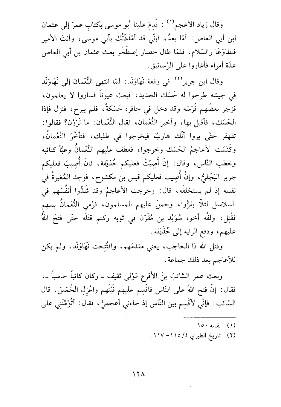 وقال ابن جرير في وقعة نهاوند: لما انتهى النعمان إلى نهاوند في جيشه طرحوا له حسك الحديد، فبعث عيونا فساروا لا يعلمون، فزجر بعضهم فرسه وقد دخل في حافره حسكة، فلم يبرح فنزل فإذا الحسك فأقبل بها، وأخبر النعمان فقال النعمان: ما ترون؟ فقالوا: تقهقر حتى يروا أنك هارب فيخرجوا في طلبك فتأخ النعمان وكنست الأعاجم الحسك، وخرجوا فعطف عليهم النعمان وعبأ كتائبه وخطب الناس، وقال: إن أصبت فعليكم حذيفة، فإن أصيب فعليكم جرير البجلي، وإن أصيب فعليكم قيس بن مكشوح، فوجد المغيرة في نفسه إذ لم يستخلفه، قال: وخرجت الأعاجم وقد شدوا أنفسهم في السلاسل لئلا يفروا، وحمل عليهم المسلمون، فرمي النعمان بسهم فقتل، ولفه أخوه سويد بن مقرن ف ثوبه وكتم قتله حتى فتح الله عليهم، ودفع الراية إلى حذيفة.