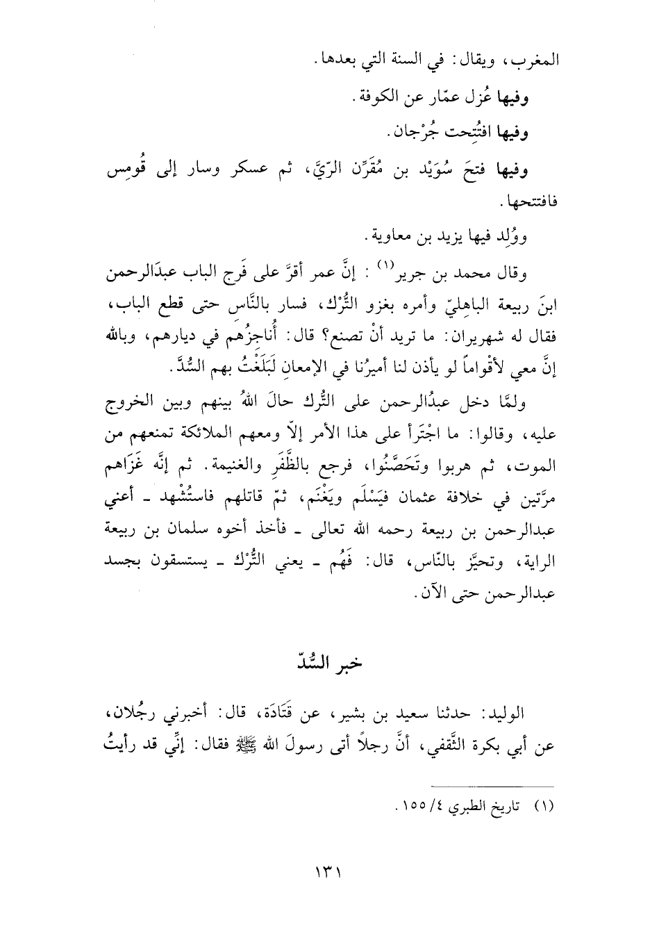 بغزو الترك، فسار بالناس حتى قطع الباب، فقال له شهريران: ما تريد أن تصنع؟ قال: أناجزهم في ديارهم، وبالله إن معي لأقواما لو يأذن لنا أميرنا في الإمعان لبلغت بهم السد.