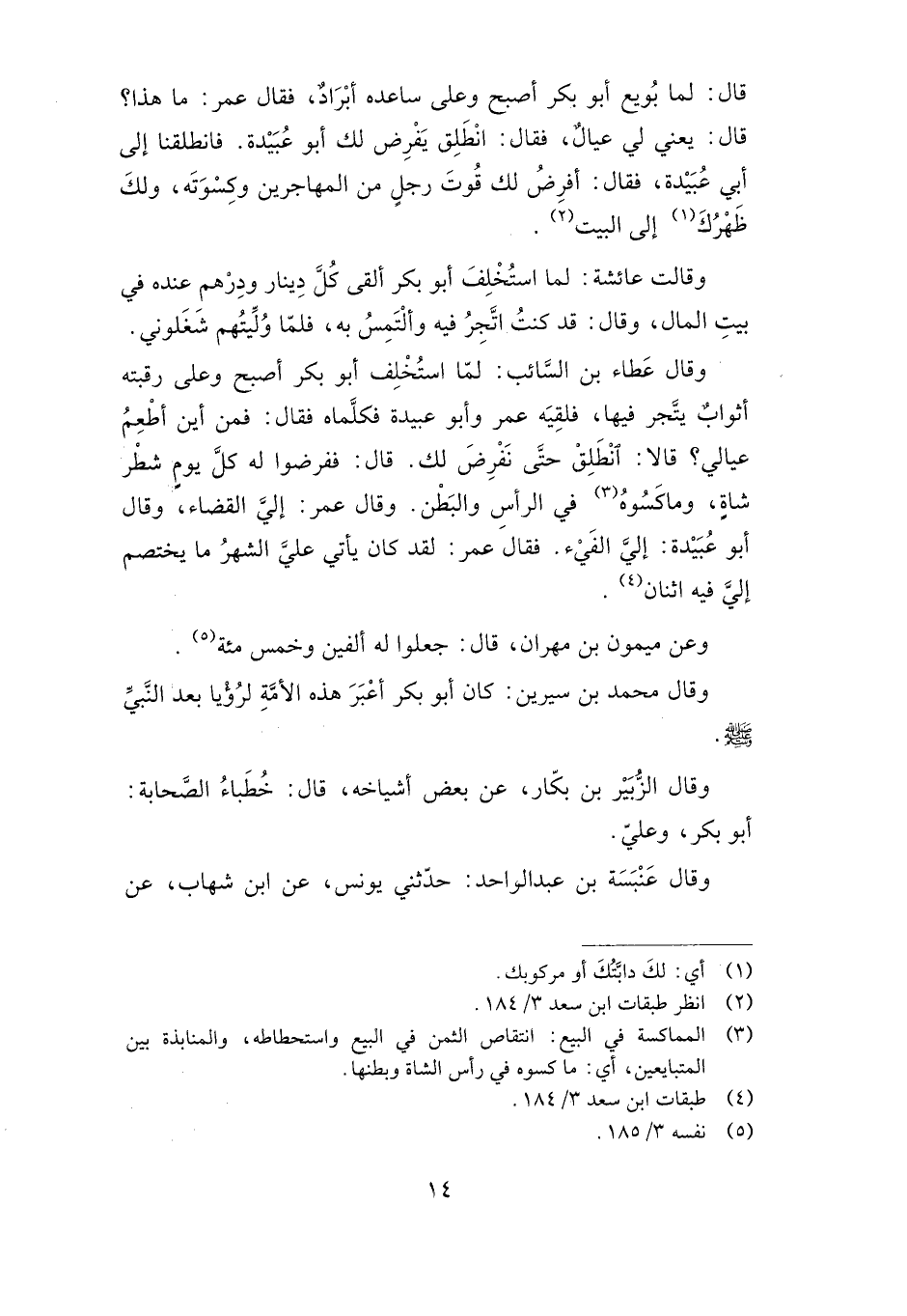 قال: لما بويع أبو بكر أصبح وعلى ساعده أبراد، فقال عمر: ما هذا؟ قال: يعني لي عيال، فقال: انطلق يفرض لك أبو عبيدة. فانطلقنا إلى أبي عبيدة، فقال: أفرض لك قوت رجل من المهاجرين وكسوته، ولك ظهرك إلى البيت.