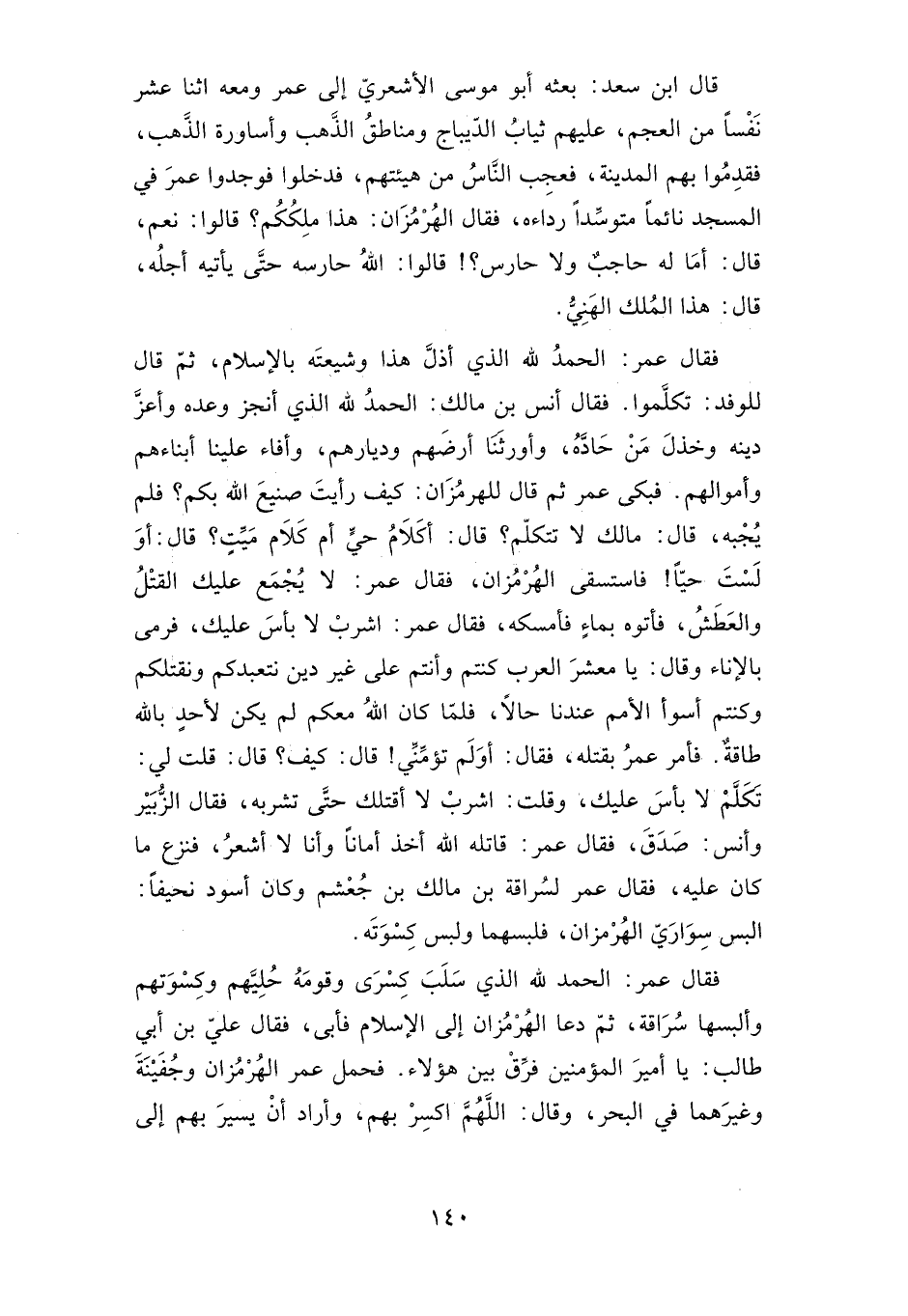فقال عمر: الحمد لله الذي أذل هذا وشيعته بالإسلام، ثم قال للوفد: تكلموا. فقال أنس بن مالك: الحمد لله الذي أنجز وعده وأعز دينه وخذل من حاده، وأورثنا أرضهم وديارهم، وأفاء علينا أبناءهم وأموالهم. فبكى عمر ثم قال للهرمزان: كيف رأيت صنيع الله بكم؟ فلم يجبه، قال: مالك لا تتكلم؟ قال: أكلام حي أم كلام ميت؟ قال: أولست حيا! فاستسقى الهرمزان، فقال عمر: لا يجمع عليك القتل والعطش، فأتوه بماء فأمسكه، فقال عمر: اشرب لا بأس عليك، فرمى بالإناء وقال: يا معشر العرب كنتم وأنتم على غير دين نتعبدكم ونقتلكم وكنتم أسوأ الأمم عندنا حالا، فلما كان الله معكم لم يكن لأحد بالله طاقة.