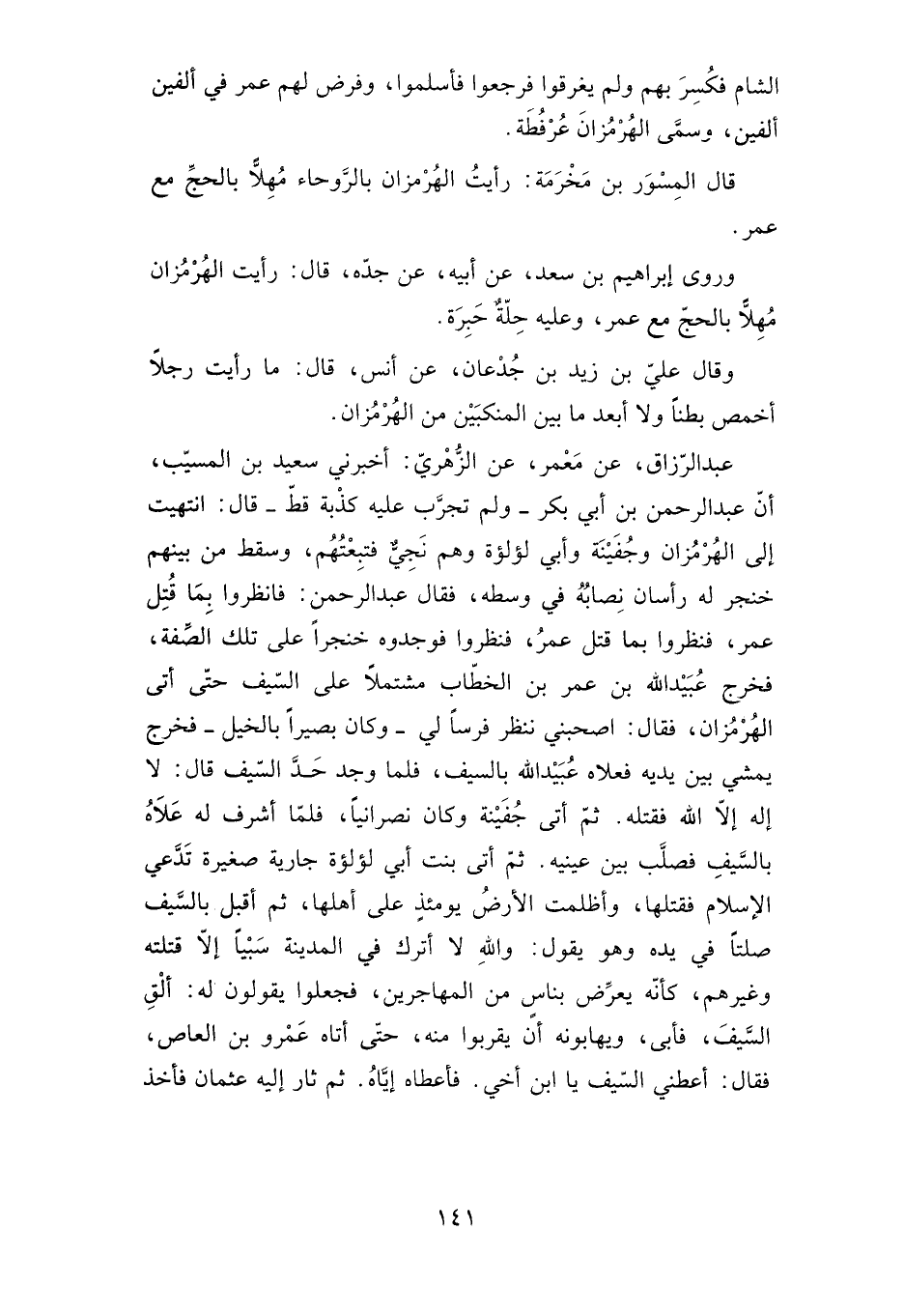 وروى إبراهيم بن سعد، عن أبيه، عن جده، قال: رأيت الهرمزان مهلا بالحج مع عمر، وعليه حلة حبرة.