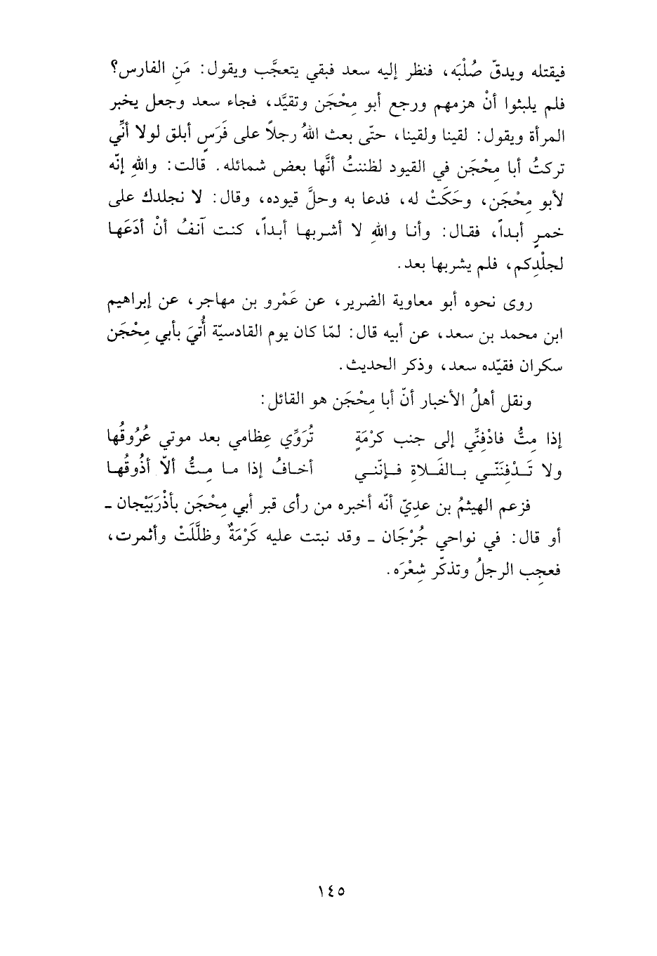 فيقتله ويدق صلبه، فنظر إليه سعد فبقي يتعجب ويقول: من الفارس؟ فلم يلبثوا أن هزمهم ورجع أبو محجن وتقيد، فجاء سعد وجعل يخبر المرأة ويقول: لقينا ولقينا، حتى بعث الله رجلا على فرس أبلق لولا أني تركت أبا محجن في القيود لظننت أنها بعض شمائله قالت: والله إنه لأبو محجن، وحكت له، فدعا به وحل قيوده، وقال: لا نجلدك على خمر أبدا فقال: وأنا والله لا أشربها أبدا، كنت آنف أن أدعها لجلدكم، فلم يشربها بعد.