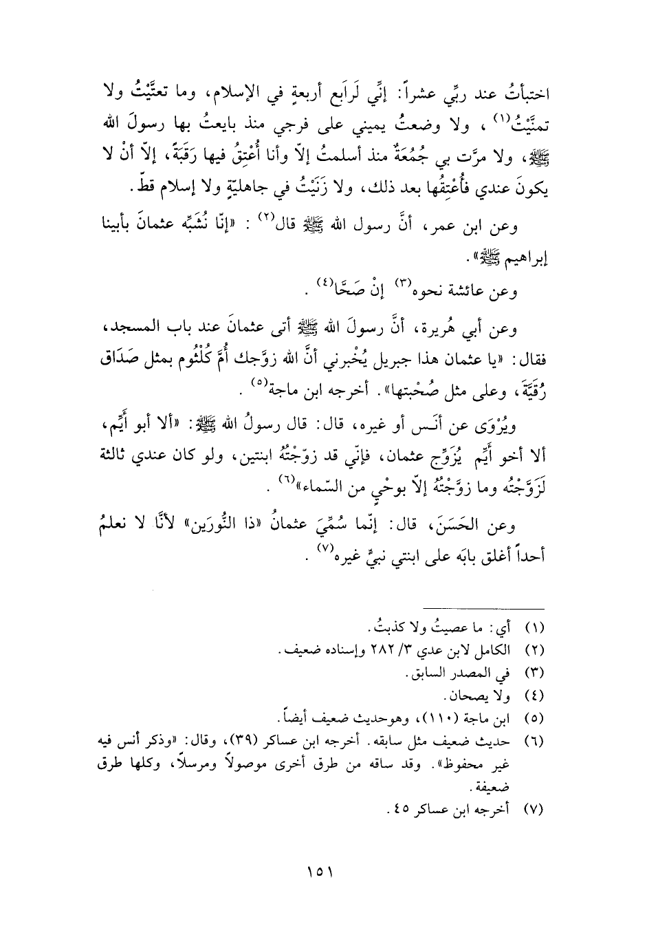 عثمان، فإني قد زوجته ابنتين، ولو كان عندي ثالثة لزوجته وما زوجته إلا بوحي من السماء".