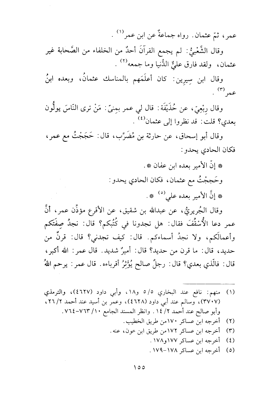 وقال الشعبي: لم يجمع القرآن أحد من الخلفاء من الصحابة غير عثمان، ولقد فارق علي الدنيا وما جمعه.