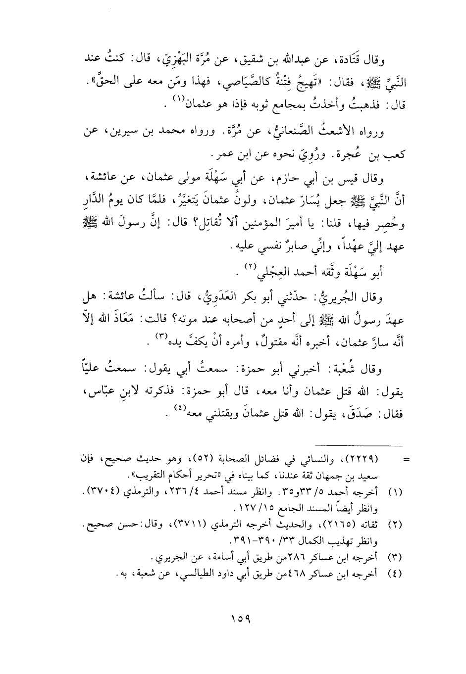 وقال قتادة، عن عبد الله بن شقيق، عن مرة البهزي، قال: كنت عند النبي صلى الله عليه وسلم فقال: "تهيج فتنة كالصياصي، فهذا ومن معه على الحق". قال: فذهبت وأخذت بمجامع ثوبه فإذا هو عثمان.