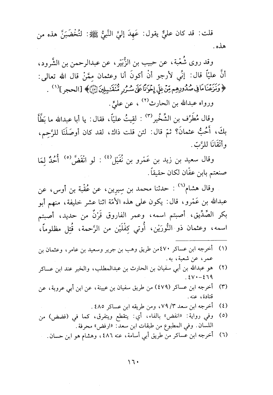وقد روى شعبة، عن حبيب بن الزبير، عن عبد الرحمن بن الشرود، أن عليا قال: إني لأرجو أن أكون أنا وعثمان ممن قال الله تعالى: {وَنَزَعْنَا مَا فِي صُدُورِهِمْ مِنْ غِلٍّ إِخْوَانًا عَلَى سُرُرٍ مُتَقَابِلِينَ} [الحجر: 47] .
