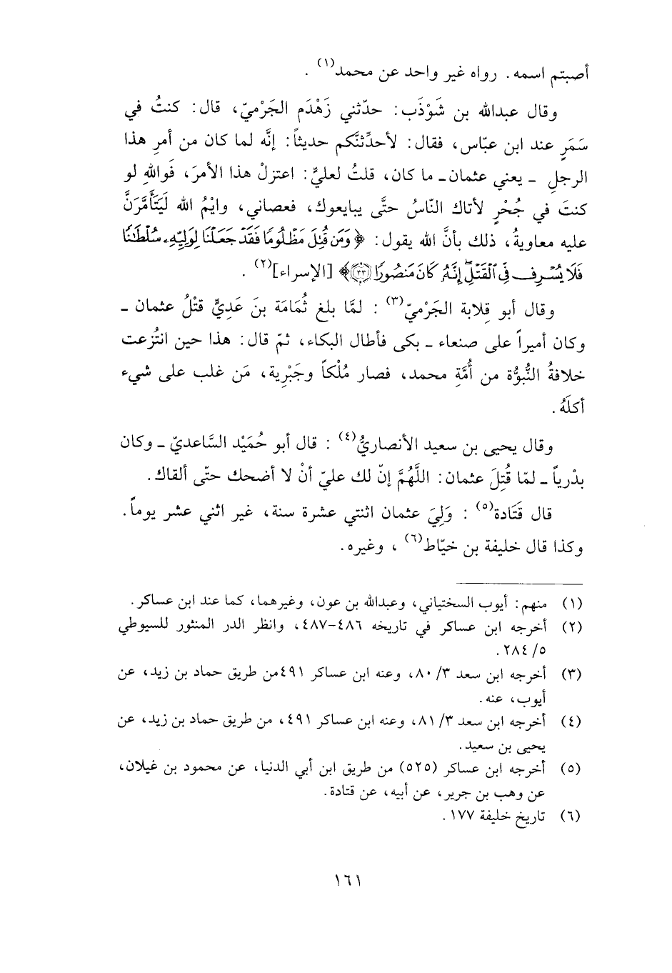 وقال عبد الله بن شوذب: حدثني زهدم الجرمي، قال: كنت في سمر عند ابن عباس، فقال: لأحدثنكم حديثا: إنه لما كان من أمر هذا الرجل -يعني عثمان- ما كان قلت لعلي: اعتزل هذا الأمر، فوالله لو كنت في حجر لأتاك الناس حتى يبايعوك، فعصاني، وايم الله ليتأمرن عليه معاوية، ذلك بأن الله يقول: {وَمَنْ قُتِلَ مَظْلُومًا فَقَدْ جَعَلْنَا لِوَلِيِّهِ سُلْطَانًا فَلا يُسْرِفْ فِي الْقَتْلِ إِنَّهُ كَانَ مَنْصُورًا} [الإسراء: 33] .
