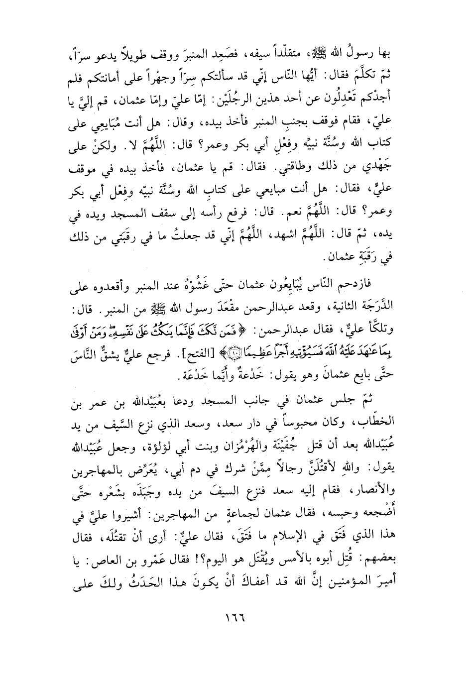 فازدحم الناس يبايعون عثمان حتى غشوه عند المنبر وأقعدوه على الدرجة الثانية، وقعد عبد الرحمن مقعد رسول الله صلى الله عليه وسلم من المنبر، قال: وتلكأ علي، فقال عبد الرحمن: {فَمَنْ نَكَثَ فَإِنَّمَا يَنْكُثُ عَلَى نَفْسِهِ وَمَنْ أَوْفَى بِمَا عَاهَدَ عَلَيْهُ اللَّهَ فَسَيُؤْتِيهِ أَجْرًا عَظِيمًا} [الفتح] .