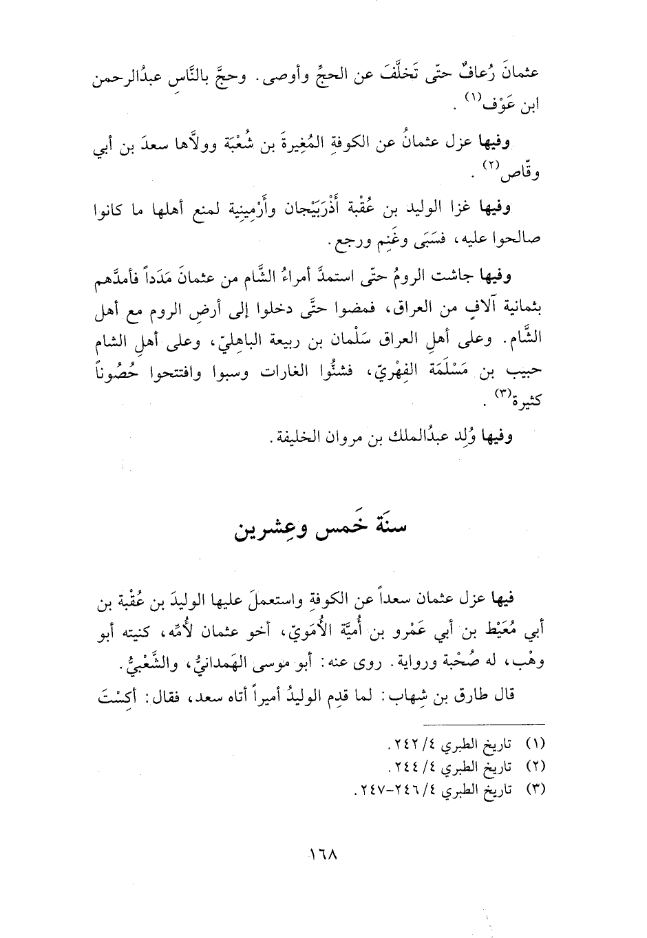 فيها: عزل عثمان سعدا عن الكوفة واستعمل عليها الوليد بن عقبة بن أبي معيط بن أبي عمرو بن أمية الأموي، أخو عثمان لأمه، كنيته أبو وهب، وله صحبة ورواية. روى عنه: أبو موسى الهمداني، والشعبي.