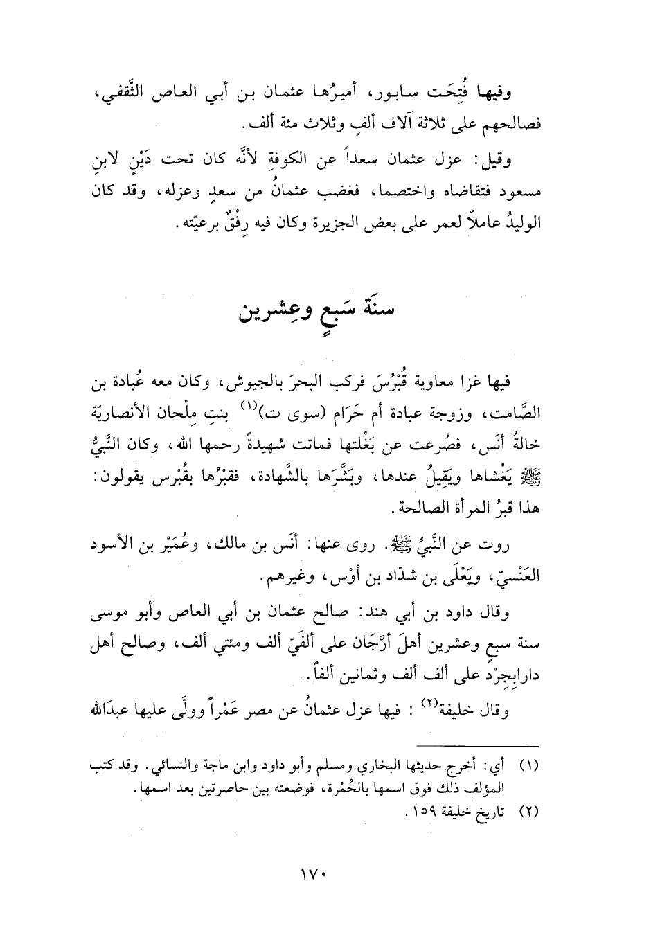 فيها: غزا معاوية قبرس فركب البحر بالجيوش، وكان معه عبادة بن الصامت، وزوجة عبادة أم حرام "سوى ت" بنت ملحان الأنصارية خالة أنس، فصرعت عن بغلتها فماتت شهيدة -رحمها الله، وكان النبي صلى الله عليه وسلم يغشاها ويقيل عندها، وبشرها بالشهادة، فقبرها بقبرس يقولون: هذا قبر المرأة الصالحة.
