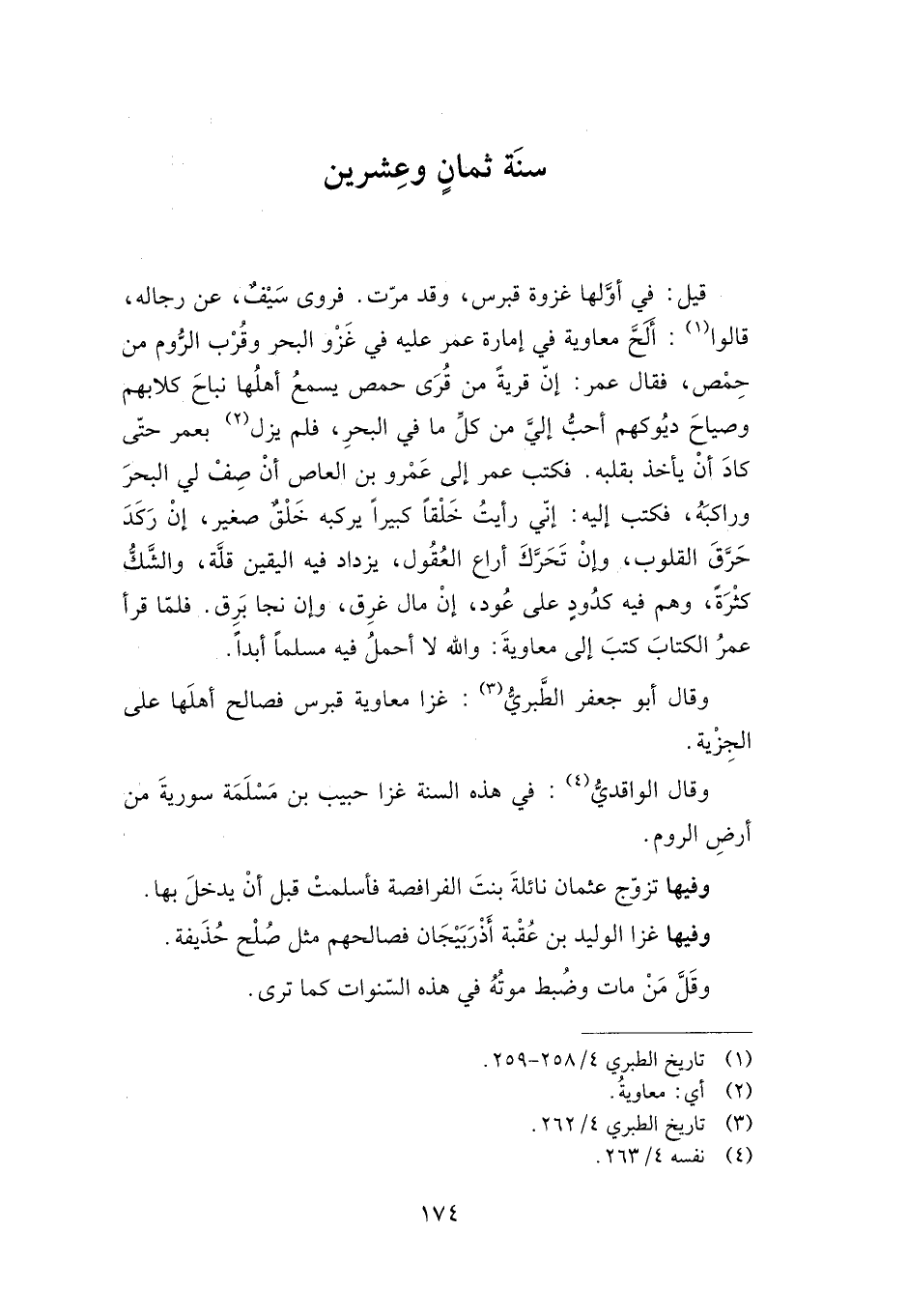 قيل: في أولها غزوة قبرس، وقد مرت فروى سيف، عن رجاله، قالوا: ألح معاوية في إمارة عمر عليه في غزو البحر وقرب الروم من حمص، فقال عمر: إن قرية من قرى حمص يسمع أهلها نباح كلابهم وصياح ديوكهم أحب إلي من كل ما في البحر، فلم يزل بعمر حتى كاد أن يأخذ بقلبه، فكتب عمر إلى عمرو بن العاص أن صف لي البحر وراكبه، فكتب إليه: إني رأيت خلقا كبيرا يركبه خلق صغير، إن ركد حرق القلوب، وإن تحرك أراع العقول، يزداد فيه اليقين قلة، والشك كثرة، وهم فيه كدود على عود، إن مال غرق، وإن نجا برق.