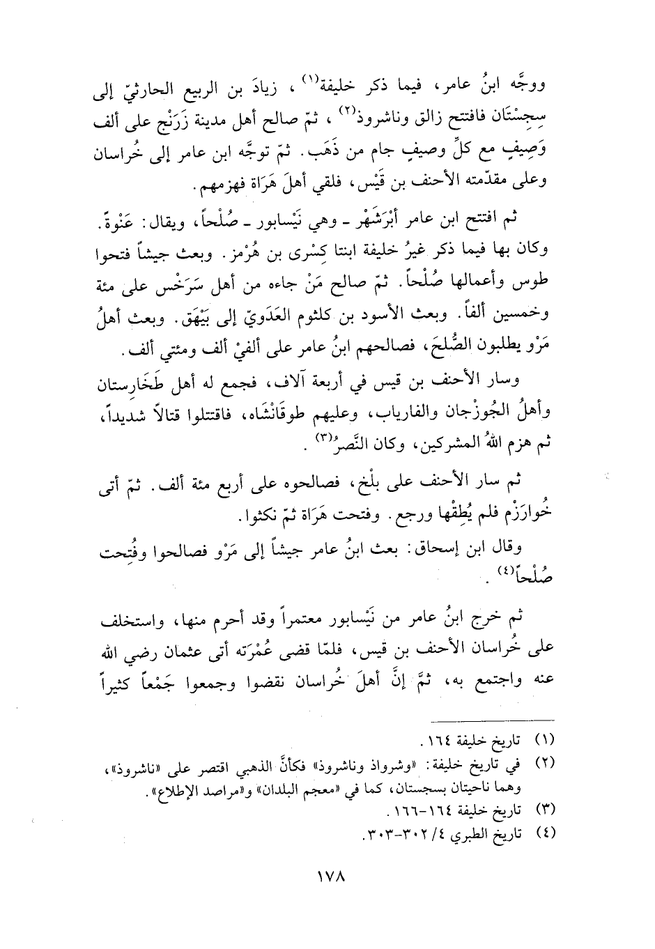 ووجه ابن عامر، فيا ذكر خليفة، زياد بن الربيع الحارثي إلى سجستان فافتتح زالق وناشروذ، ثم صالح أهل مدينة زرنج على ألف وصيف مع كل وصيف جام من ذهب، ثم توجه ابن عامر إلى خراسان وعلى مقدمته الأحنف بن قيس، فلقي أهل هراة فهزمهم.