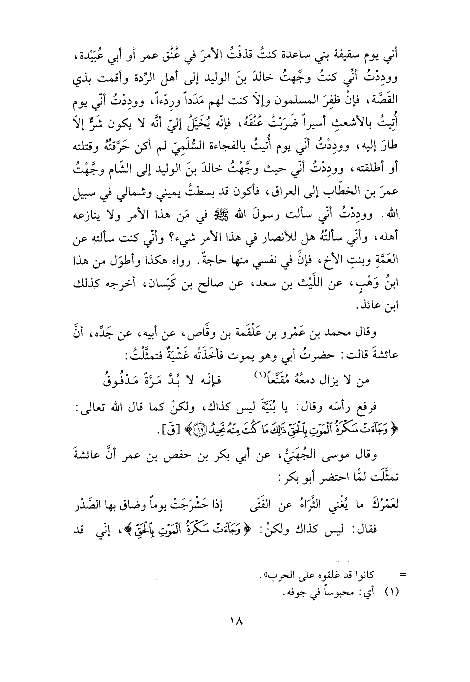 أني يوم سقيفة بني ساعدة كنت قذفت الأمر في عنق عمر أو أبي عبيدة، ووددت أني كنت وجهت خالد بن الوليد إلى أهل الردة، وأقمت بذي القصة، فإن ظفر المسلمون وإلا كنت لهم مددا وردءا، وودت أني يوم أتيت بالأشعث أسيرا ضربت عنقه، فإنه يخيل إلي أنه لا يكون شر إلا طار إليه، ووددت أني يوم أتيت بالفجاءة السلمي لم أكن حرقته وقتلته أو أطلقته، ووددت أني حيث وجهت خالد بن الوليد إلى الشام وجهت عمر بن الخطاب إلى العراق، فأكون قد بسطت يميني وشمالي في سبيل الله، وودت أني سألت رسول الله صلى الله عليه وسلم في من هذا الأمر ولا ينازعه أهله، وأني سألته هل للأنصار في هذا الأمر شيء؟ وأني كنت سألته عن العمة وبنت الأخ، فإن في نفسي منها حاجة. رواه هكذا وأطول من هذا ابن وهب، عن الليث بن سعد، عن صالح بن كيسان، أخرجه كذلك ابن عائذ.