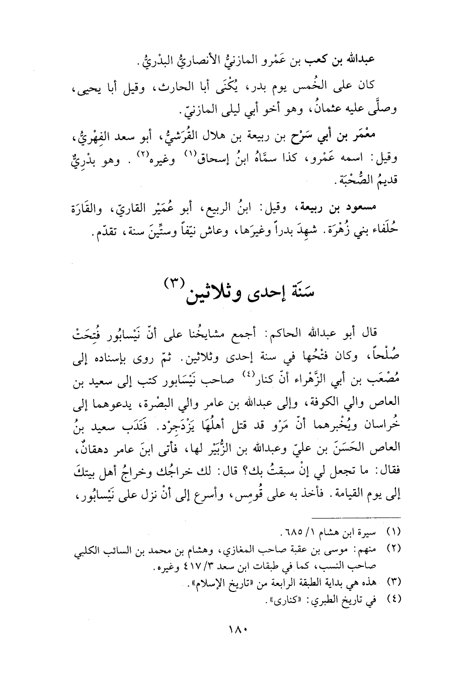 قال أبو عبد الله الحاكم: أجمع مشايخنا على أن نيسابور فتحت صلحا، وكان فتحها في سنة إحدى وثلاثين. ثم روى بإسناده إلى مصعب بن أبي الزهراء أن كنار صاحب نيسابور كتب إلى سعيد بن العاص والي الكوفة، وإلى عبد الله بن عامر والي البصرة يدعوهما إلى خراسان، ويخبرهما أن مرو قد قتل أهلها يزدجرد. فندب سعيد بن العاص الحسن بن علي