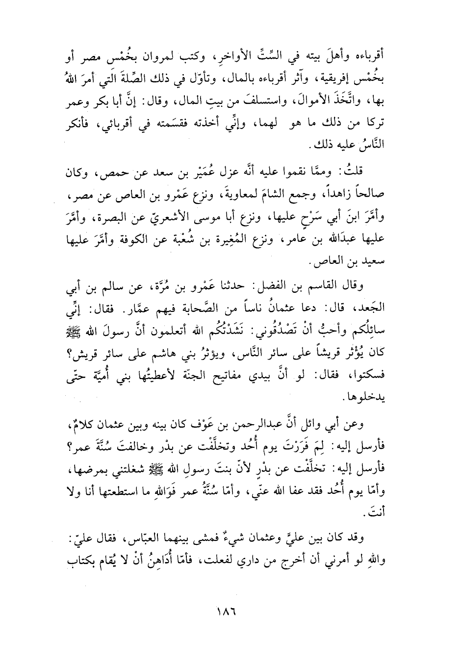 قلت: ومما نقموا عليه أنه عزل عمير بن سعد عن حمص، وكان صالحا زاهدا، وجمع الشام لمعاوية، ونزع عمرو بن العاص عن مصر، وأمر ابن أبي سرح عليها، ونزع أبا موسى الأشعري عن البصرة، وأمر عليها عبد الله بن عامر، نزع المغيرة بن شعبة عن الكوفة وأمر عليها سعيد بن العاص.