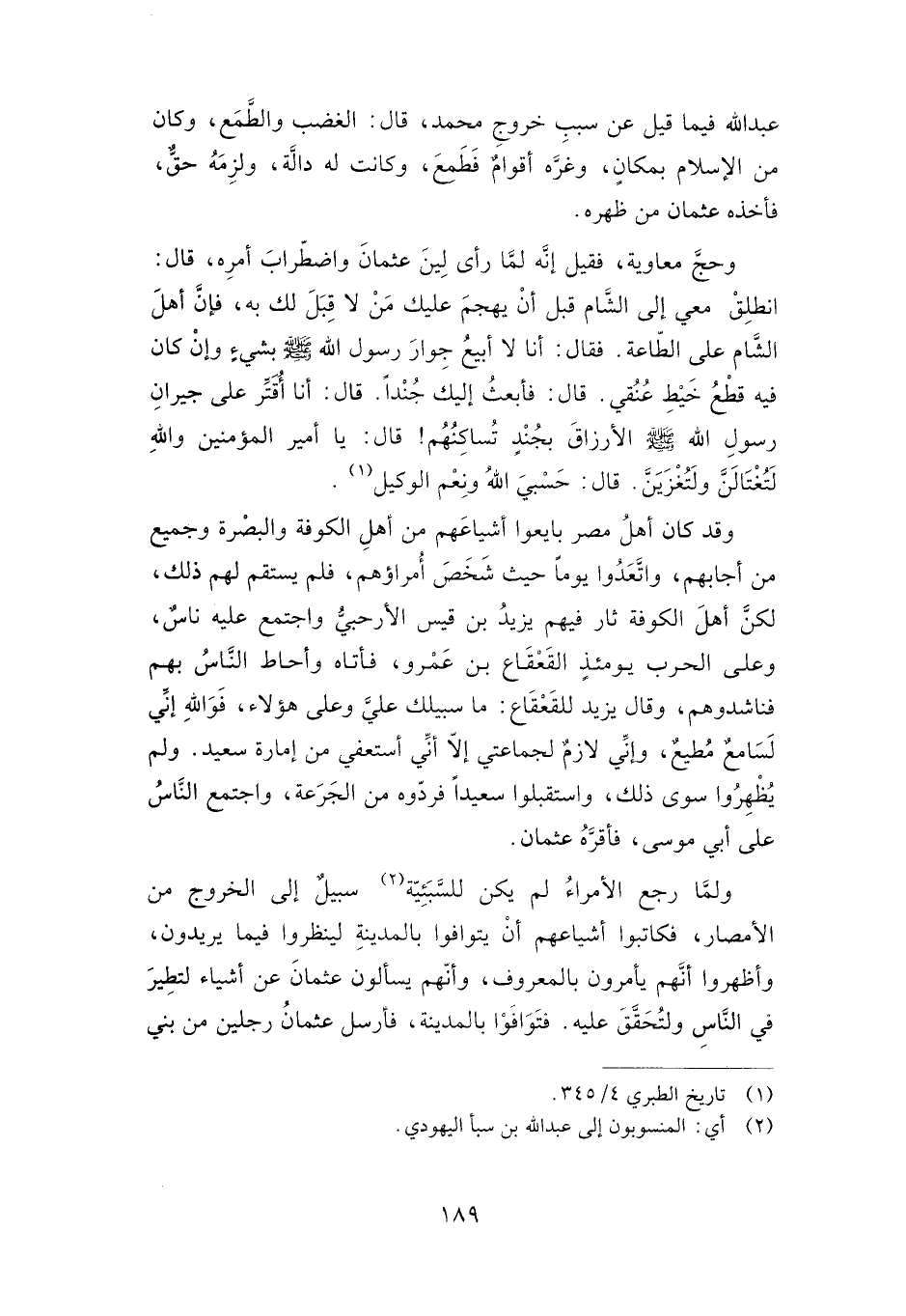 عبد الله فيما قيل عن سبب خروج محمد قال: الغضب والطمع، وكان من الإسلام بمكان، وغره أقوام فطمع، وكانت له دالة، ولزمه حق، فأخذه عثمان من ظهره.
