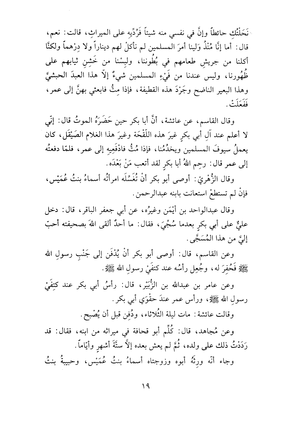 وقال القاسم عن عائشة، أن أبا بكر حين حضره الموت قال: إني لا أعلم عند آل أبي بكر غير هذه اللقحة وغير هذا الغلام الصيقل، كان يعمل سيوف المسلمين ويخدمنا، فإذا مت فادفعيه إل عمر، فلما دفعته إلى عمر قال: رحم الله أبا بكر لقد أتعب من بعده.