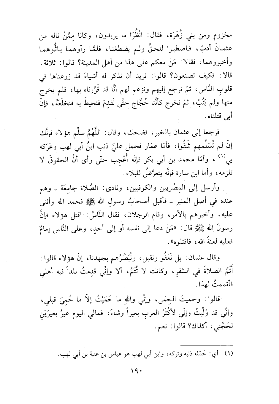 مخزوم ومن بني زهرة، فقال: انظرا ما يريدون، وكانا ممن ناله من عثمان أدب، فاصطبرا للحق ولم يضطغنا، فلما رأوهما باثوهما وأخبروهما، فقالا: من معكم على هذا من أهل المدينة؟ قالوا: ثلاثة قالا: فكيف تصنعون؟ قالوا: نريد أن نذكر له أشياء قد زرعناها في قلوب الناس، ثم نرجع إليهم ونزعم لهم أنا قد قررناه بها، فلم يخرج منها ولم يتب، ثم نخرج كأننا حجاج حتى نقدم فنحيط به فنخلعه، فإن أبى قتلناه.