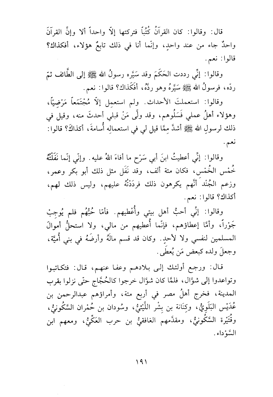 وقالوا: إني أعطيت ابن أبي سرح ما أفاء الله عليه. وإني إنما نفلته خمس الخمس، فكان مائة ألف، وقد نفل مثل ذلك أبو بكر وعمر، وزعم الجند أنهم يكرهون ذلك فرددته عليهم، وليس ذلك لهم، أكذاك؟ قالوا: نعم.