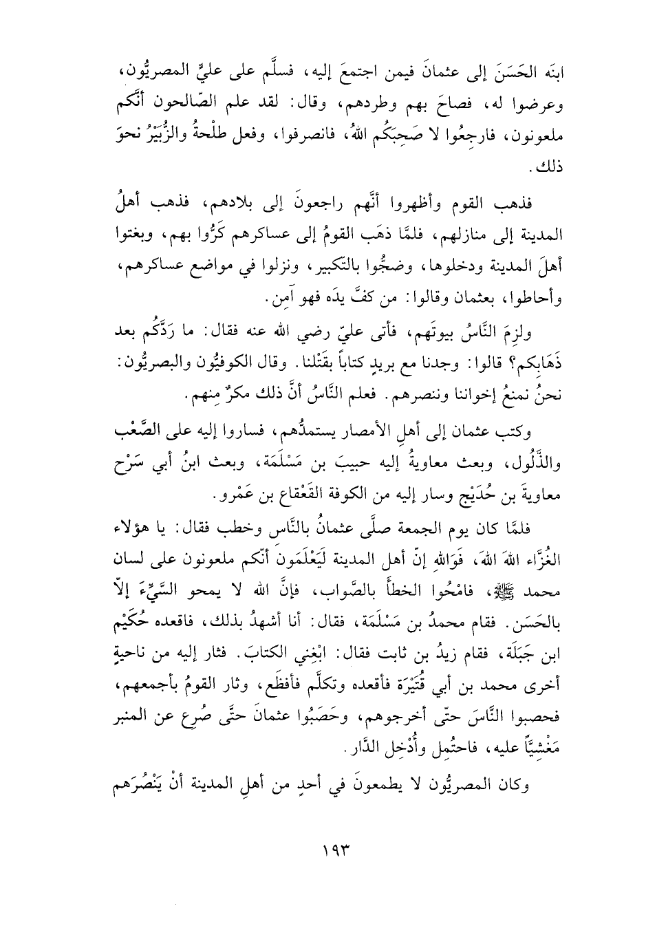 ابنه الحسن إلى عثمان فيمن اجتمع إليه، فسلم على علي المصريون، وعرضوا له، فصاح بهم وطردهم، وقال: لقد علم الصالحون أنكم ملعونون، فارجعوا لا صحبكم الله، فانصرفوا، وفعل طلحة والزبير نحو ذلك.
