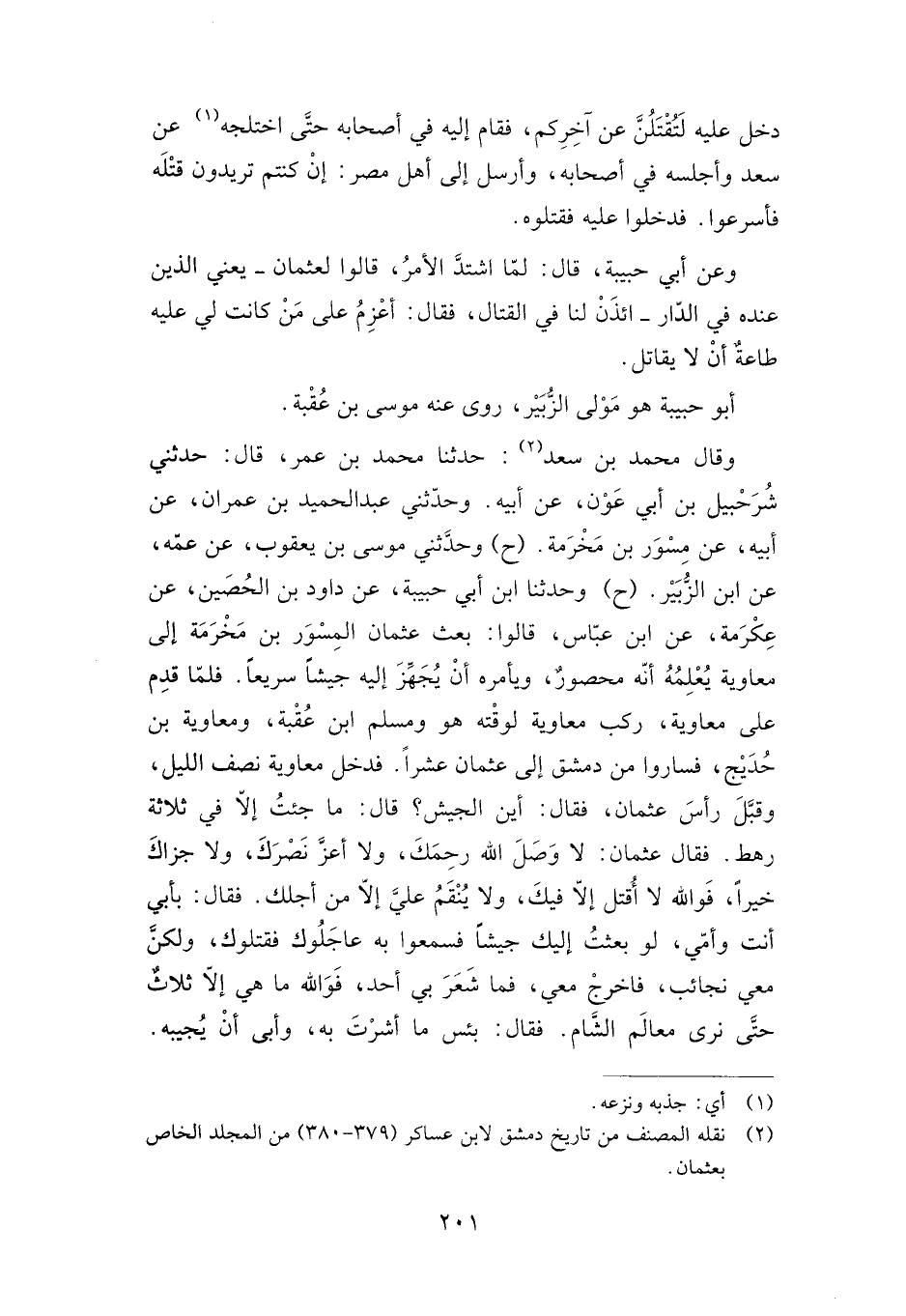 دخل عليه لتقتلن عن آخركم، فقام إليه في أصحابه حتى اختلجه عن سعد وأجلسه في أصحابه، وأرسل إلى أهل مصر: إن كنتم تريدون قتله فأسرعوا. فدخلوا عليه فقتلوه.