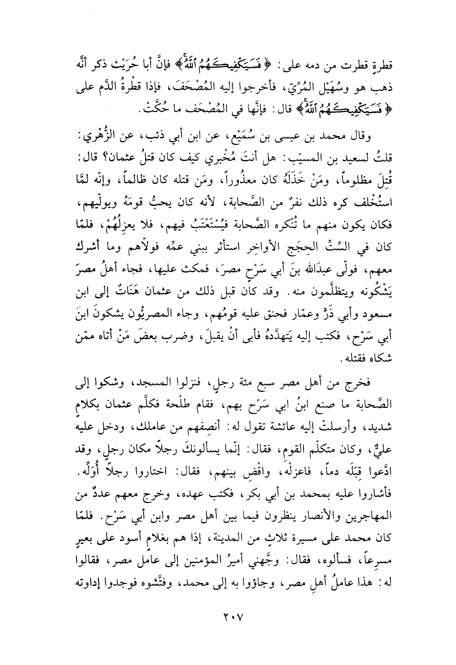 قطرة قطرت من دمه على: {فَسَيَكْفِيكَهُمُ اللَّهُ} فإن أبا حريث ذكر أنه ذهب وهو وسهيل المرى، فأخرجوا إليه المصحف، فإذا قطرة الدم على {فَسَيَكْفِيكَهُمُ اللَّهُ} قال: فإنها في المصحف ما حكت.