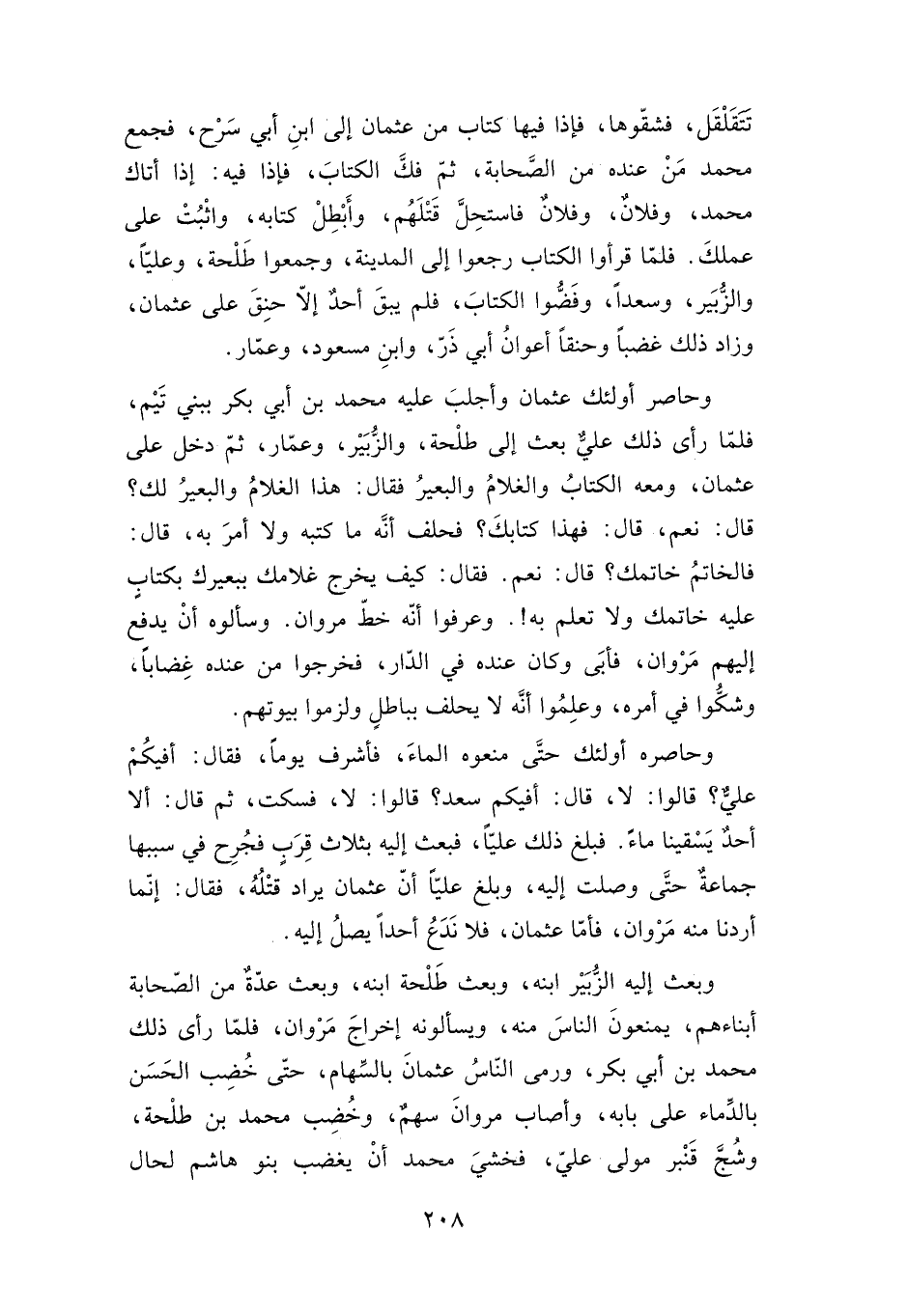 تتقلقل، فشقوها، فإذا فيها كتاب من عثمان إلى ابن أبي سرح، فجمع محمد من عنده من الصحابة، ثم فك الكتاب، فإذا فيه: إذا أتاك محمد، وفلان، وفلان فاستحل قتلهم، وأبطل كتابه، واثبت على عملك. فلما قرأوا الكتاب رجعوا إلى المدينة، وجمعوا طلحة، وعليا، والزبير، وسعدا، وفضوا الكتاب، فلم يبق أحد إلا حنق على عثمان، وزاد ذلك غضبا وحنقا أعوان أبي ذر، وابن مسعود، وعمار.