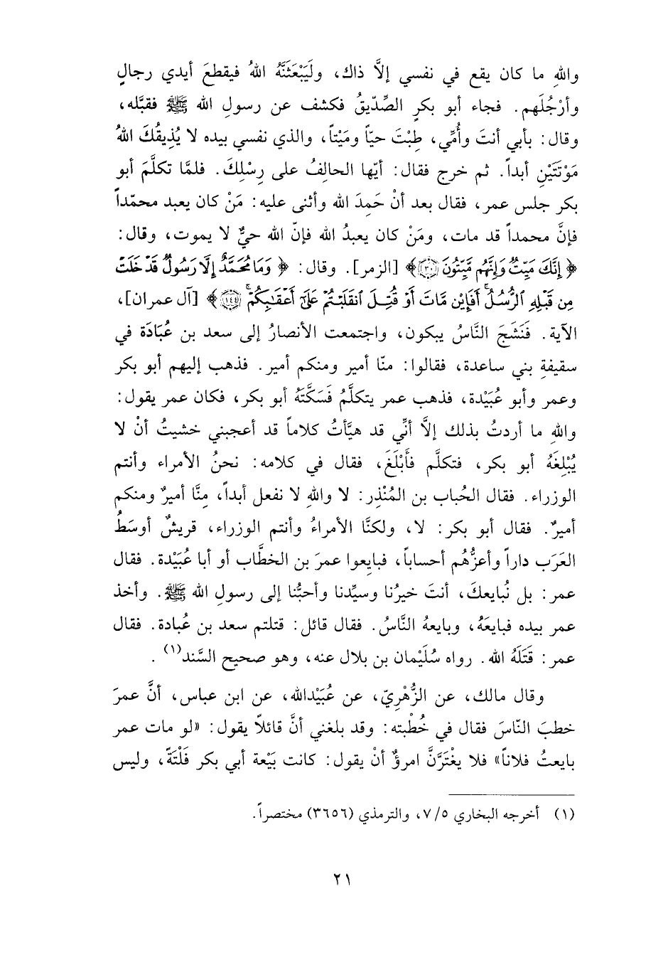 والله ما كان يقع في نفسي إلا ذاك، وليبعثنه الله فيقطع أيدي رجال وأرجلهم. فجاء أبو بكر الصديق فكشف عن رسول الله صلى الله عليه وسلم فقبله، وقال: بأبي أنت وأمي، طبت حيا وميتا، والذي نفسي بيده لا يذيقك الله موتتين أبدا. ثم خرج فقال: أيها الحالف على رسلك. فلما تكلم أبو بكر جلس عمر، فقال بعد أن حمد الله وأثنى عليه: من كان يعبد محمدا فإن محمدا قد مات، ومن كان يعبد الله فإن الله حي لا يموت، وقال: {إِنَّكَ مَيِّتٌ وَإِنَّهُمْ مَيِّتُون} [الزمر: 30] ، وقال: {وَمَا مُحَمَّدٌ إِلَّا رَسُولٌ قَدْ خَلَتْ مِنْ قَبْلِهِ الرُّسُلُ أَفَإِنْ مَاتَ أَوْ قُتِلَ انْقَلَبْتُمْ عَلَى أَعْقَابِكُمْ} [آل عمران: 144] ، فنشج الناس يبكون، واجتمعت الأنصار إلى سعد بن عبادة في سقيفة بني ساعدة فقالوا: منا أمير ومنكم أمير. فذهب إليهم أبو بكر وعمر وأبو عبيدة، فذهب عمر يتكلم فسكته أبو بكر، فكان عمر يقول: والله ما أردت بذلك إلا أني قد هيأت كلاما قد أعجبني خشيت أن لا يبلغه أبو بكر، فتكلم فأبلغ، فقال في كلامه: نحن الأمراء وأنتم الوزراء. فقال الحباب بن المنذر: لا والله لا نفعل أبدا، منا أمير ومنكم أمير. فقال أبو بكر: لا، ولكنا الأمراء وأنتم الوزراء، قريش أوسط العرب دارا وأعزهم أحسابا، فبايعوا عمر بن الخطاب أو أبا عبيدة. فقال عمر: بل نبايعك، أنت خيرنا وسيدنا وأحبنا إلى رسول الله صلى الله عليه وسلم. وأخذ عمر بيده فبايعه، وبايعه الناس فقال قائل: قتلتم سعد بن عبادة فقال عمر: قتله الله. رواه سليمان بن بلال عنه، وهو صحيح السند.