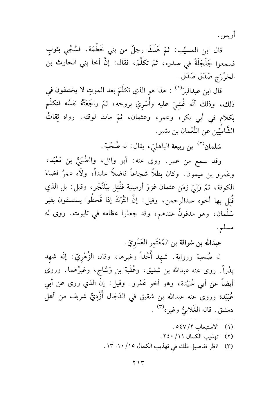 قال ابن عبد البر: هذا هو الذي تكلم بعد الموت لا يختلفون في ذلك، وذلك أنه غشي عليه وأسري بروحه، ثم راجعته نفسه فتكلم بكلام في أبي بكر، وعمر، وعثمان، ثم مات لوقته. رواه ثقات الشاميين عن النعمان بن بشير.