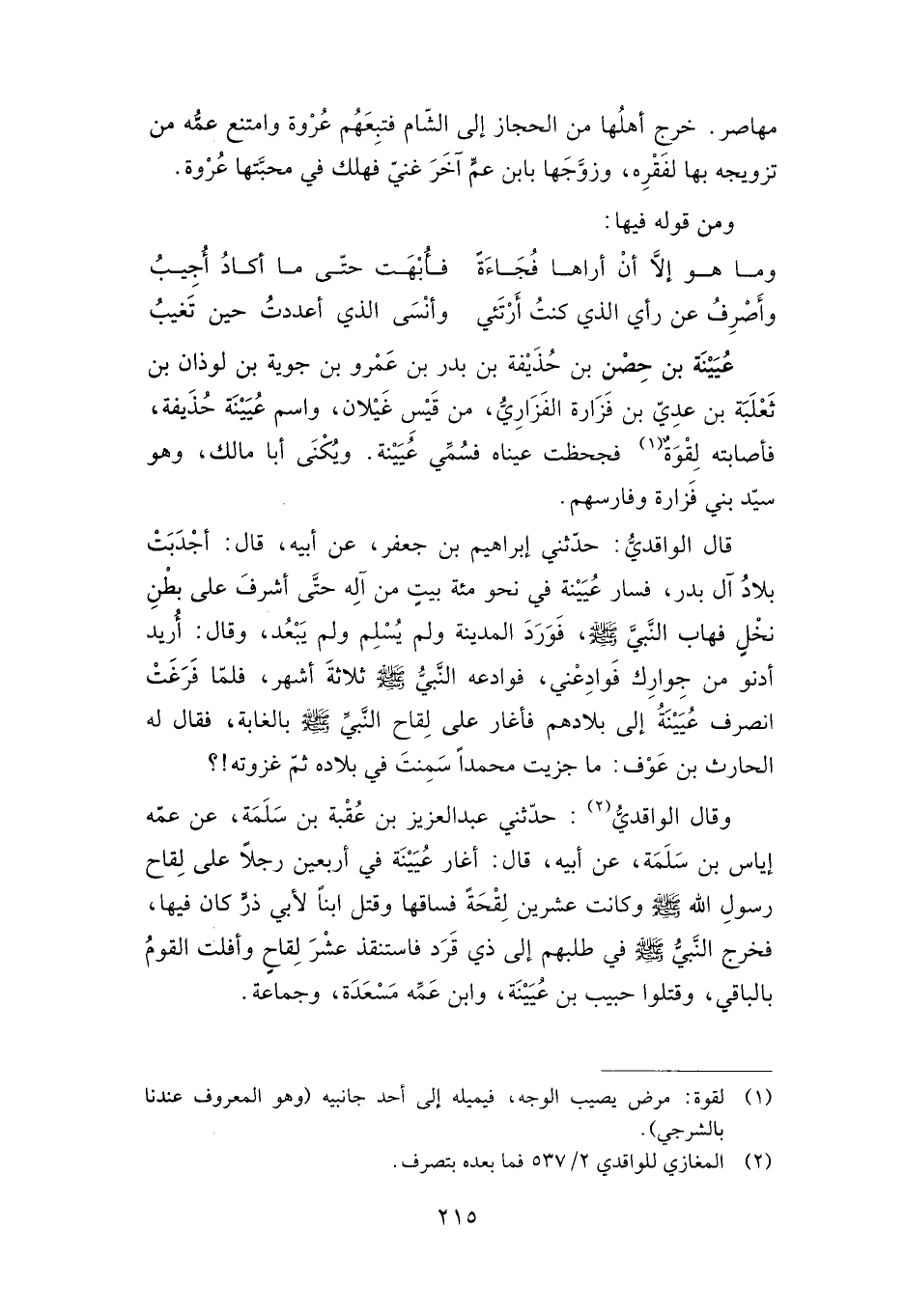 قال الواقدي: حدثني إبراهيم بن جعفر، عن أبيه قال: أجدبت بلاد آل بدر، فسارعيينة في نحو مائة بيت من آله حتى أشرف على بطن نخل فهاب النبي صلى الله عليه وسلم، فورد المدينة ولم يسلم ولم يبعد، وقال: أريد أدنو من جوارك فوادعني فوادعه النبي صلى الله عليه وسلم ثلاثة أشهر، فلما فرغت انصرف عيينة إلى بلادهم فأغار على لقاح النبي صلى الله عليه وسلم بالغابة، قال له الحارث بن عوف: ما جزيت محمدًا سمنت في بلاده ثم غزوته!؟
