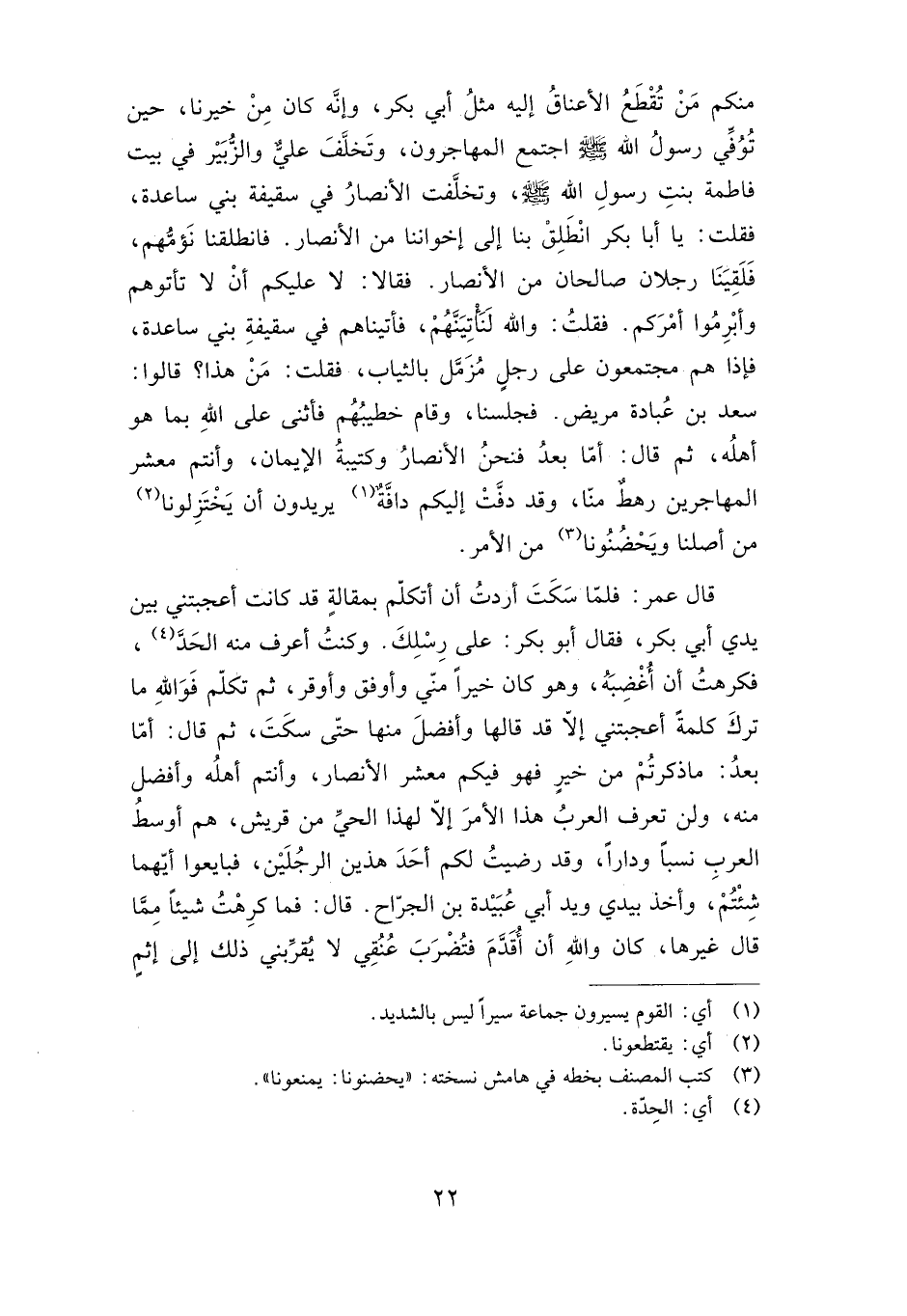 منكم من تقطع العناق إليه مثل أبي بكر، وإنه كان خيرنا، حين توفي رسول الله صلى الله عليه وسلم اجتمع المهاجرون، وتخلف علي والزبير في بيت فاطمة بنت رسول الله صلى الله عليه وسلم، وتخلفت الأنصار في سقيفة بني ساعدة، فقلت: يا أبا بكر انطلق بنا إلى إخواننا من الأنصار. فانطلقنا نؤمهم، فلقينا رجلان صالحان من الأنصار. فقالا: لا عليكم أن لا تأتوهم وأبرموا أمركم. فقلت: والله لنأتينهم، فأتيناهم في سقيفة بني ساعدة، فإذا هم مجتمعون على رجل مزمل بالثياب، فقلت: من هذا؟ قالوا: سعد بن عبادة مريض فجلسنا، وقام خطيبهم فأثنى على الله بما هو أهله، ثم قال: أما بعد فنحن الأنصار وكتيبة الإيمان، وأنتم معشر المهاجرين رهط منا، وقد دفت إليكم دافة يريدون أن يختزلونا من أصلنا ويحضنونا من الأمر.