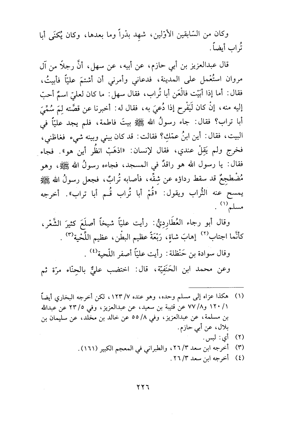 قال عبد العزيز بن أبي حازم، عن أبيه، عن سهل، أن رجلا من آل مروان استعمل على المدينة، فدعاني وأمرني أن أشتم عليا فأبيت، فقال: أما إذا أبيت فالعن أبا تراب، فقال سهل: ما كان لعلي اسم أحب إليه منه، إن كان ليفرح إذا دعي به، فقال له: أخبرنا عن قصته لم سمي أبا تراب؟ فقال: جاء رسول الله صلى الله عليه وسلم بيت فاطمة، فلم يجد عليا في البيت، فقال: "أين ابن عمك"؟ قالت: قد كان بيني وبينه شيء فغاظني، فخرج ولم يقل عندي، فقال لإنسان: "اذهب انظر أين هو". فجاء فقال: يا رسول الله هو راقد في المسجد، فجاءه رسول الله صلى الله عليه وسلم، وهو مضطجع قد سقط رداؤه عن شقه، فأصابه تراب، فجعل رسول الله صلى الله عليه وسلم يمسح عنه التراب ويقول: "قم أبا تراب قم أبا تراب". أخرجه مسلم.