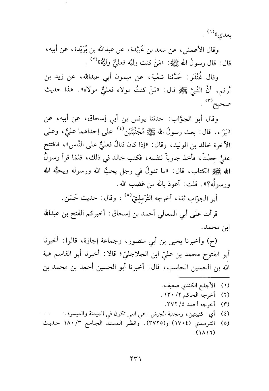 "ح" وأخبرنا يحيى بن أبي منصور، وجماعة إجازة، قالوا: أخبرنا أبو الفتوح محمد بن علي بن الجلاجلي؛ قالا: أخبرنا أبو القاسم هبة الله بن الحسين الحاسب، قال: أخبرنا أبو الحسين أحمد بن محمد بن