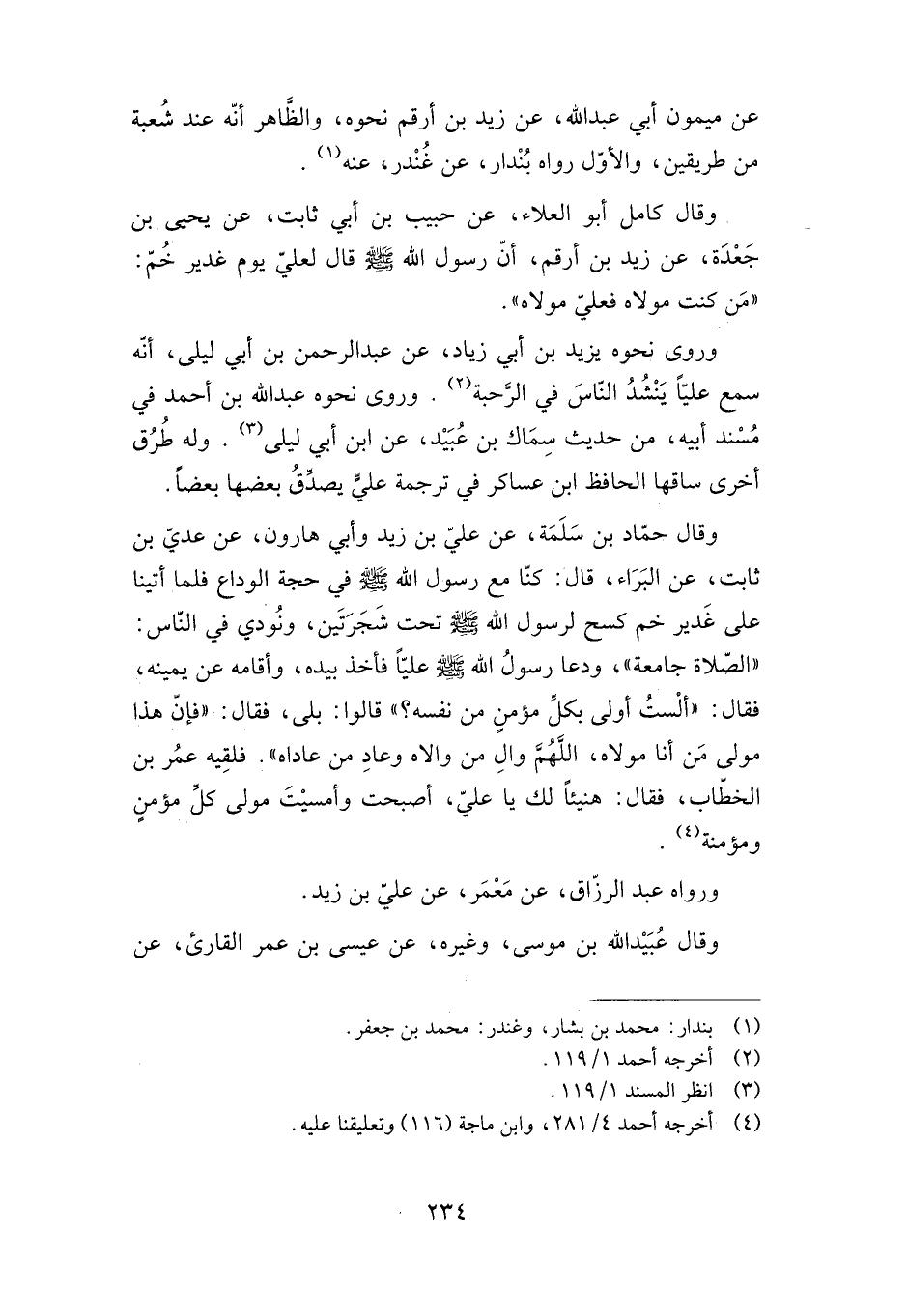 مولى من أنا مولاه، اللهم وال من والاه وعاد من عاداه". فلقيه عمر بن الخطاب، فقال: هنيئا لك يا علي، أصبحت وأمسيت مولى كل مؤمن ومؤمنة.